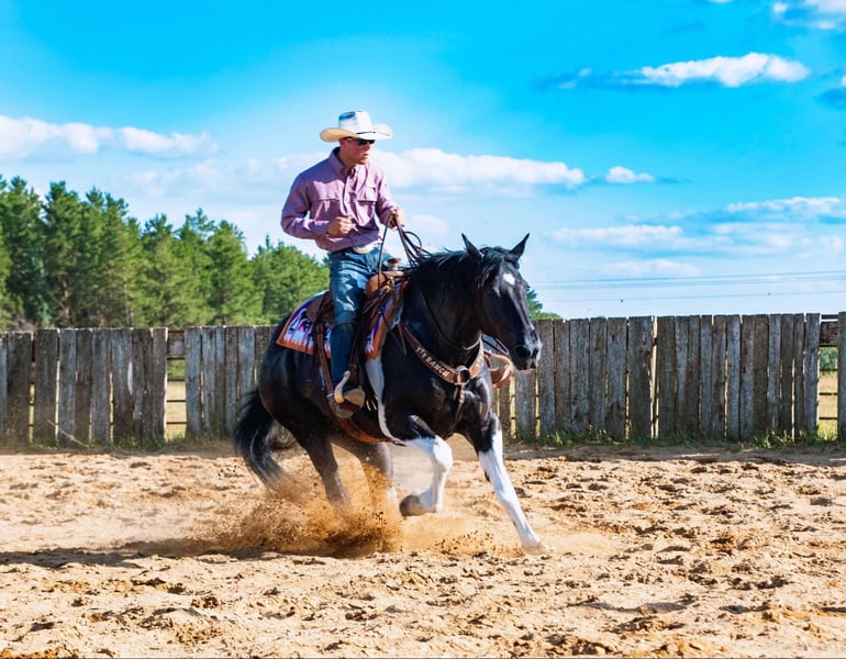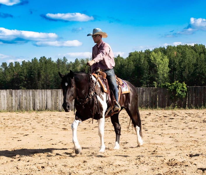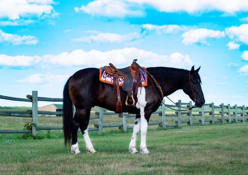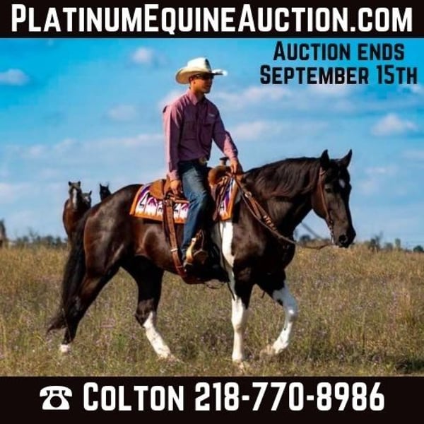 ONLINE AUCTION Place your bids at www.PlatinumEquineAuction.com Starting Bid $3500 Auction ends September 15th, 2024 Need a new saddle? Check out White Rock Saddles on our website or Facebook! Big Joe, a Spotted Draft and Quarter Horse crossbred gelding, that exemplifies the best of both breeds, combining strength, endurance, and a gentle temperament. Standing an impressive 16 hands tall, he is 10 years old, he is a powerful presence, yet his calm demeanor makes him an ideal companion for various equestrian activities. His size and build reflect the draft horse heritage, contributing to his ability to handle heavy workloads and rugged terrain with ease. Being used on the ranch, Big Joe has developed a solid foundation in working cattle and other ranching tasks. His experience on the ranch has also made him a reliable trail horse, particularly suited to mountain riding where sure-footedness and stamina are essential. His ability to navigate challenging landscapes has been proven on numerous occasions, showcasing his agility and confidence in diverse environments. In addition to his ranch work, Big Joe is a skilled performer in the arena. He can lope collected circles, demonstrating a balanced and controlled movement that speaks to his training and athletic ability. This versatility extends to his participation in overnight pack trips, where his reliability and steadiness become invaluable assets. Whether working or recreating, Big Joe remains composed and cooperative, making him a favorite among riders. Moreover, Big Joe’s manners and ease of handling make him a pleasure to care for. He loads easily into trailers, bathes without fuss, and is comfortable with having his feet handled, reflecting his well-rounded training. On the ground, he is the epitome of a gentleman, displaying a calm and respectful attitude that endears him to those who work with him. His combination of physical prowess, training, and temperament make Big Joe an exceptional horse for both work and leisure. Located in Nevis, Minnesota. Contact Tripe T Livestock Colton 218-770-8986 with any questions. ONLINE AUCTION Place your bids at www.PlatinumEquineAuction.com Starting Bid $3500 Auction ends September 15th, 2024 Need a new saddle? Check out White Rock Saddles on our website or Facebook!