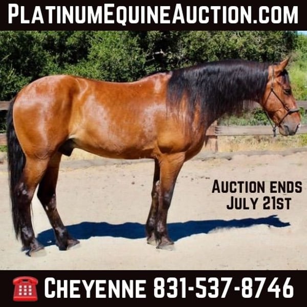 ONLINE AUCTION Place your bids at www.PlatinumEquineAuction.com Starting Bid $3500 Auction ends July 21st, 2024 Need a new saddle? Check out White Rock Saddles on our website or Facebook! Whopper is a gorgeous 15.3HH crossbred gelding and the prime age of 12 years old. Whopper has every bit of “the look” you could want in a horse. Kind eye, big solid size 1 shoe, good bone, and hair for days! Whopper has a very kind, sweet personality and is always eager to see his person everyday. Whopper has beautiful gaits that are easier to sit than a rocking chair. He stays very collected at the poll and moves beautifully each way. He was started riding English and excels in that aspects of riding just as much as western. He has jumped low level jumps and done some dressage maneuvers. Whopper has been rode down many crowded streets, full of bikers, automobiles, as well as the occasional runner. He doesn’t blink an eye at any chaotic sounds or sights. This boy has a big motor and will go all day long without hesitation. He will lead the group or go out alone all just the same. He loves water and will be the first to get in the creeks! On the ground he is very well mannered, calm and stands flat footed tied for grooming, farrier and to be tacked up. Whopper is a one of a kind gelding looking to find his perfect match! He is located in Bitterwater, CA. For more info or schedule a time to see his sweet guy, contact Cheyenne Rey 831-537-8746. ONLINE AUCTION Place your bids at www.PlatinumEquineAuction.com Starting Bid $3500 Auction ends July 21st, 2024 Need a new saddle? Check out White Rock Saddles on our website or Facebook!