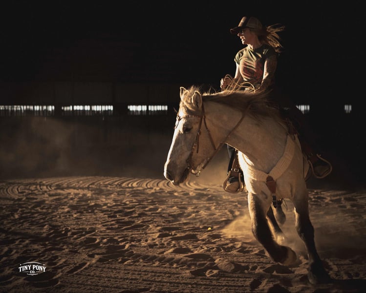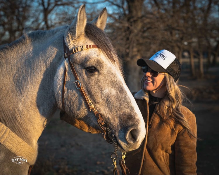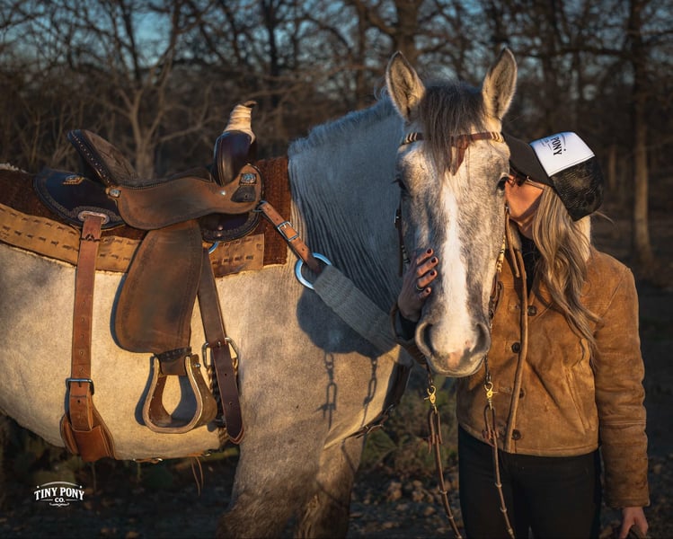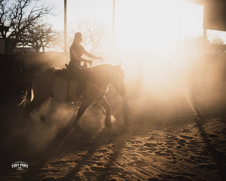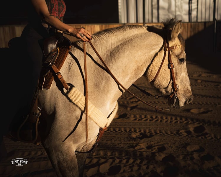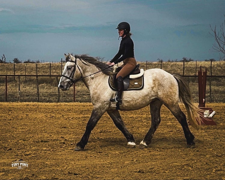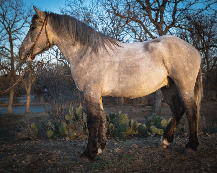 "AVAILABLE ON ONLINE HORSE AUCTION AT www DOT PlatinumEquineAuction DOT com BIDDING OPEN NOW thru SUNDAY | MARCH 15TH! *Final price will be determined on auction site* CONSIGNOR CONTACT INFO: Tiny Pony Co. 406-250-9530 LOCATION: Jacksboro, TX The horse that stays for the still, quiet moments. The one that always chooses your company, that makes you feel like the most important person on the planet - that’s Blackfoot. Not only is he rare in color and shape - not everyday you see a 15.2h line-backed silver buckskin Percheron/QH cross - but his calm, grounding energy is just as unique. He will happily put his head in your arms and stay that way as long as your heart desires. As a coming 4 year old, Blackfoot has a solid foundation and lovely manners. He will lope a circle, pick up all four feet, carry you down the trail, meet you at the gate, and put a smile on your face everyday. He is a solid traveler and enjoys off property adventures - he unloads confidently in new places. Blackfoot has been on field trips to other arenas where we have tested him out over low fences - and he has shown us two of the qualities we love the most : honesty and willingness. He is a comfortable ride, with three beautiful gaits - a lively walk, a soft, easy to sit trot and a smooth lope. He has learned to be responsive to leg cues and is already quite soft in the bridle. Blackfoot is easy to mount from the ground and stands still for you, every time. Flags, tarps, roping dummies, scattering chickens, darting barn cats - nothing seems to phase him. He will stand quietly and patiently on a loose, relaxed rein. With nice sized, sure feet and a strong, compact build, Blackfoot was born to carry weight. He would make an excellent backcountry trail mount, laid-back pleasure horse or your next personal therapist. This gelding has an easy going temperament and steady mind - he is the perfect example of why draft crosses are so popular - and we think the future is bright for this one. Blackfoot is relaxed in a herd, landing near the bottom of the pecking order. He also lives peacefully in a stall. He is currently barefoot and on a forage only diet - he has no trouble keeping his shape. He sells sound and UTD on vaccines - PPE welcome at buyer’s expense. Located in Jacksboro, TX. Text or call Courtney Maddux @ 406.250.9530 for with your questions!
