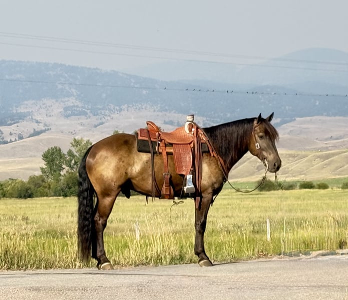 ♦️ 𝐭𝐡𝐞 𝐀𝐌𝐄𝐑𝐈𝐂𝐀𝐍 𝓕𝓪𝓵𝓵 𝓒𝓵𝓪𝓼𝓼𝓲𝓬 ♦️ Happening now thru MONDAY | OCTOBER 20th - Available EXCLUSIVELY on HorseBid's website! For more details and to register visit: www.Horsebid.com CONSIGNOR CONTACT: Flint Creek Quarter Horses 406-544-9987 LOCATION: Drummond MT BREED: Crossbred Quarter Horse REGISTERED: No COLOR: Buckskin/ Seal Brown HEIGHT: 14.3 AGE: 5 GENDER: Gelding Buddy is a 5 yr old crossbred grade quarter horse gelding that stands 14.3 hands. He is dark buckskin in the summer months and dark seal brown in the winter. He is a very friendly gentle guy that anyone that knows how to ride could get along with. He has been a ranch and trail horse his whole life doing all the ranch chores like pasture doctoring and pushing cows around. He will pull anything you can latch onto. He has a good one hand, neck rein and has all the proper buttons on him. He will step to his correct leads both directions and will lope nice circles. He will side pass to open and close gates and has a pretty good turnaround. He is trained to let you get on him off of a step or fence, simply Smooch to him and he will side pass over and make it easy for you to get on. He crosses water and all the trail obstacles and is a pleasure to ride outside. he is not buddy or barn sour and is use to riding off by himself and is the kind that will go all day and give you everything he’s got. He is a fun little gelding to ride that is fast walking and snappy when you need him to be but always quiet and gentle. He has absolutely no buck in him and is very easy to bathe, shoe, and haul. He will jump in the trailer with no problem and back out like a gentleman. This is a stout made guy with a lot of shape and bone. He’s got a big thick, wavy mane and a thick tail that drags the ground. this is a very nice young gelding at the start of his career that would make someone a great all around using Horse. Whether you want to take him to hunting camp this fall or back to the ranch, he is safe sound and ready to go to work. he is not an arena show horse by any stretch, but has been a working horse his whole life. If you think Buddy might be a good fit for you, give us a call and come and try him at the ranch. For more info call Tom at 406-544-9987