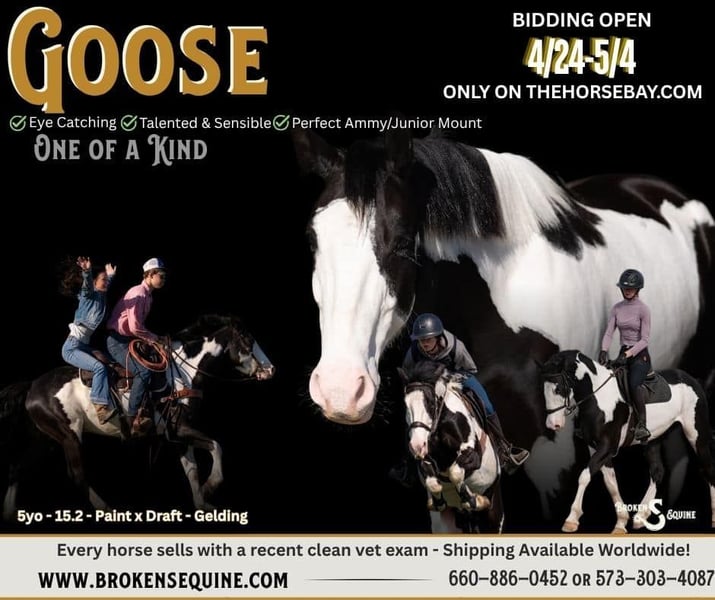 Horses like Goose don’t come along often. From his show stopping looks, to the confidence he instills in his rider, to his natural talent – in just about every discipline we have tried with him. Whether your goals are bringing home blues, honing your skills, or just having a safe and steady friend to trail ride and try new things on – Goose carries himself like he belongs, and like he’s been there a thousand times before. We truly have been having the time of our lives with him. He is just as fun in lessons in the arena, as he is riding double through the fields or out pushing cows. Take him anywhere, do anything, and have a solid and smart partner to enjoy for years to come. Duck Duck Goose is a 5 year old 15.2 hand draft x paint horse gelding. He is your do it all and have fun (and look good) doing it kind of guy. Goose is the type that makes you excited, not nervous, to try new things, go new places, and jump new heights. In the ring, Goose has a fantastic foundation that makes flatwork enjoyable and every ride seems like you’ve accomplished something new. He is so smart and willing, yet tolerant and forgiving for a more amateur rider. Goose has three quality gaits, great transitions, and a soft mouth. He is putting together first level tests with a great understanding of lateral work. He has his changes, jumps a course, and is very brave on the cross country field. Goose is very smart on his feet and honest to fences. He’s the perfect mix of whoa and go, having enough motor when asked to do the dressage or eventing job, and is still quiet and gentle enough for a timid or amateur rider to enjoy and learn on. He will also ride under western tack, has a great stop, lopes off, circles well, and neck reins. On the trails, Goose is a saddle up and go type. He will ride alone, or in a group, and is always safe and smart. He crosses bridges, water, and is safe in all kinds of traffic. Goose is a fun, reliable horse no matter where you take him. Hunter paces, team sorting, and other fun outings are always a blast with him! He is always up for a new adventure! In the barn, Goose is friendly and loves people. He is well behaved and a good boy for all of the usual barn tasks. He is goofy, yet polite, and is always sticking his head out of the stall to see what’s going on. He enjoys being groomed and soaks up attention. Goose is happy living inside or out and gets along well with mares and geldings. ⚫️Goose is an easy keeper that requires no maintenance.
