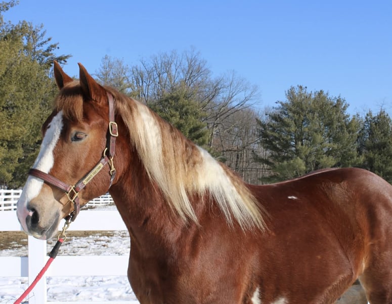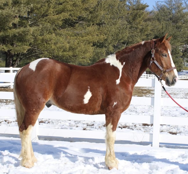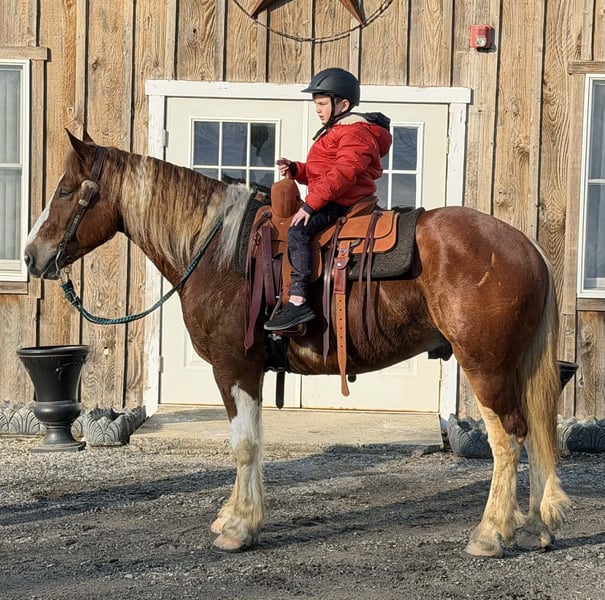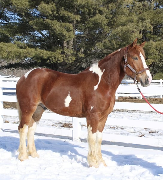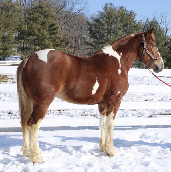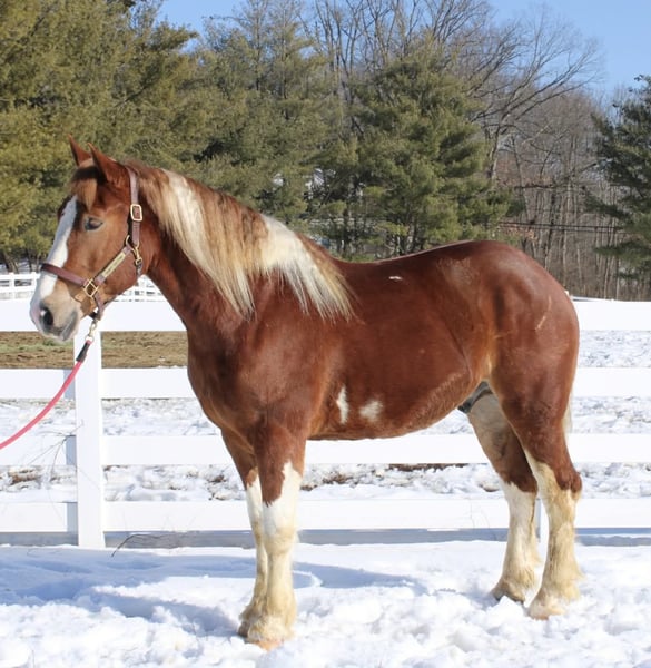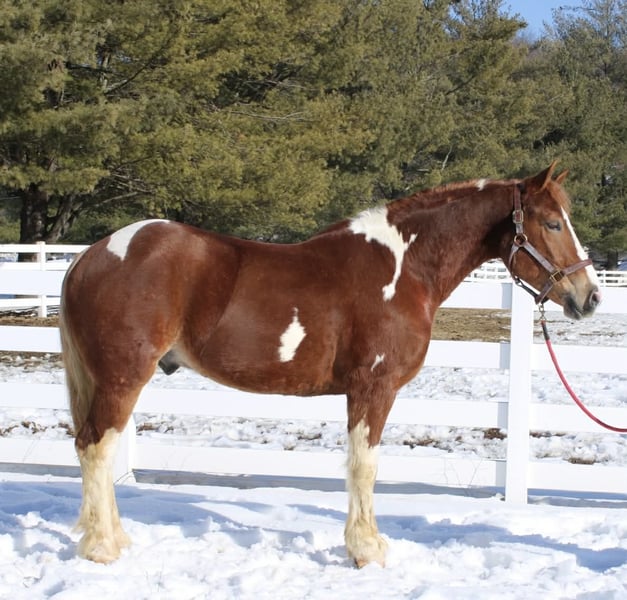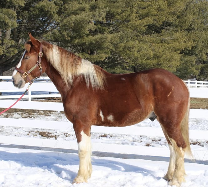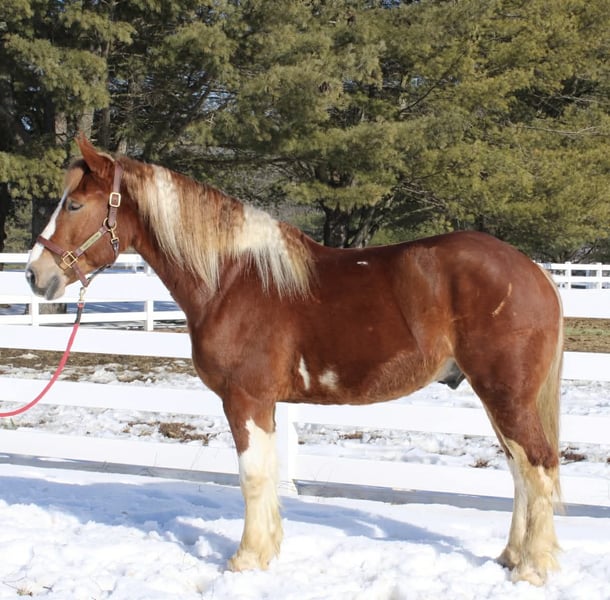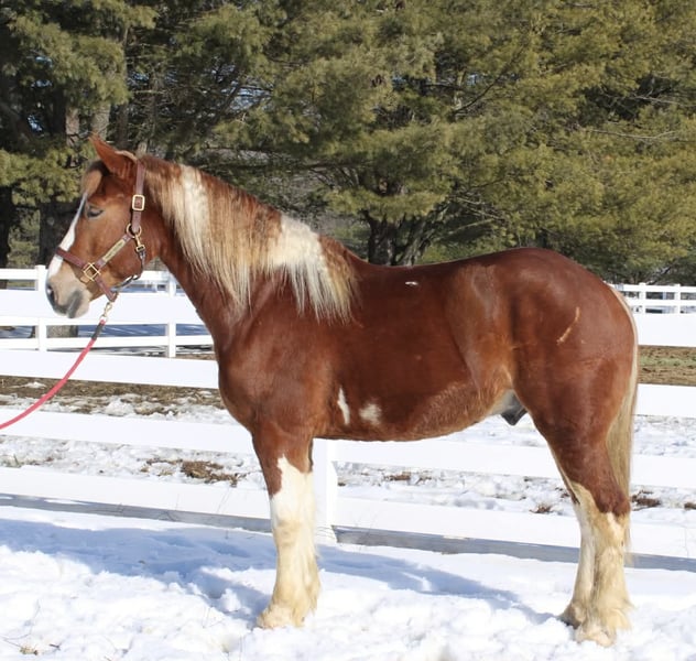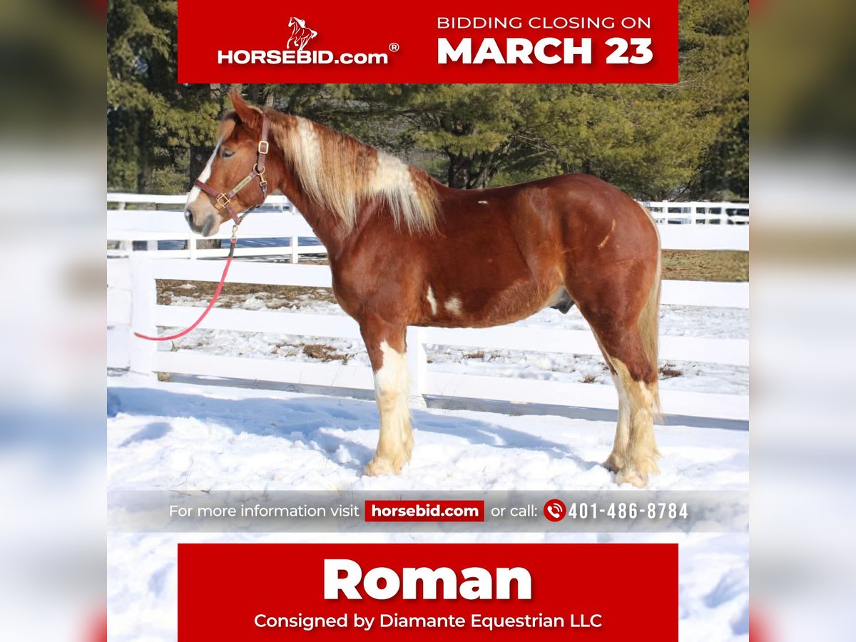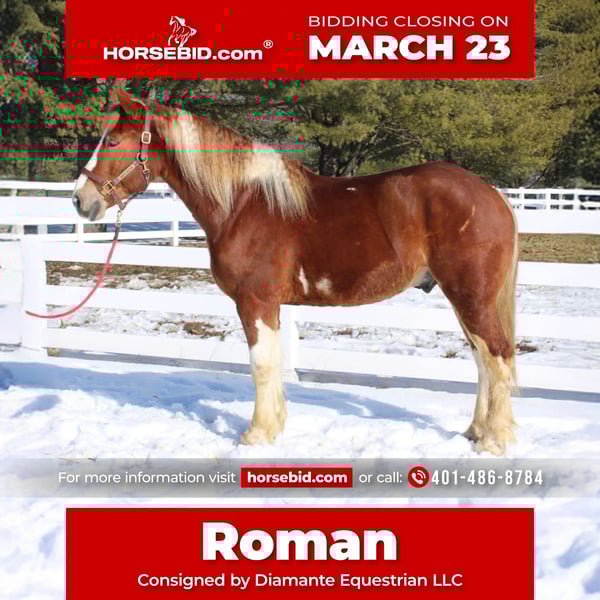 ⚜️𝓽𝓱𝓮 𝐆𝐎𝐋𝐃 𝓢𝓮𝓵𝓮𝓬𝓽⚜️ Happening now thru MONDAY | MARCH 23rd - Available EXCLUSIVELY on HorseBid's website! For more details and to register visit: www.Horsebid.com CONSIGNOR CONTACT: Diamante Equestrian LLC 401-486-8784 LOCATION: Allentown, NJ BREED: Draft cross REGISTERED: No COLOR: Sorrel and white paint HEIGHT: 15.3 AGE: 5 GENDER: Gelding Roman English Videos 🎥 Roman is a 5 year old, 15.3 hand draft cross gelding. 1/2 paint and 1/2 Belgian. He has a gorgeous head, big kind eyes and a huge heart. He has that Belgian heart for sure where he gives you everything he has and never says no. I don’t think any other breed of draft has the heart of a Belgian but he surely has it. This gelding is honest, willing, a beautiful mover, athletic and up for absolutely anything you throw at him even if it’s crazy! Rides English and western and does both disciplines VERY well. He’s really a horse that will excel in anything. In western tack he has a true two finger neck rein, turns of him haunches, moves off leg beautifully, has a jog you can sit to all day long and side passes both directions like a pro. In English tack he frames up, has a beautiful floaty trot, collects beautifully, catches his leads every single time and this gelding has the knack to jump. You show him something once and he’ll have you convinced he has been doing it his whole life. Point and shoot at the jump and he’ll get it done. We have only jumped cross rails but you can definitely go bigger if that’s the route you want to take. I think Roman would make a phenomenal fox hunter. In the arena he goes around just as one should with zero effort or work involved. He knows what he’s suppose to do and just does it. Out on the trails he is bombproof and is happy with his ears forward and licking his lips. He is completely road and traffic safe and rides out alone with zero issues. He’s confident and secure with himself so no he does not need the confidence of another horse. If you want to go with another horse he doesn’t care and he will lead or follow and he won’t fall in love so if you ride away from one another you won’t have a handful on your hands. This gelding is the same horse everytime you swing your leg over and he might even get better but I don’t know if that’s even possible because he’s so good to begin with. Best part of all he’s fun and educated enough for a really good rider but safe enough for someone that really doesn’t know what they’re doing. He’ll pack the beginners around and he’ll also take care of a child under saddle and on the ground. His ground manners are absolutely impeccable and he has a very sweet, in your pocket personality. He is great for everything and has zero vices or flaws. This is one of the best draft crosses I’ve seen in a very long time. He’s also a great size not being huge but he is a great weight carrier. This horse has great feet and bone. A very easy keeper and requires no maintenance or supplements. Lives off western alfalfa hay and looks amazing. Happily lives inside or out and has the best pasture and stall manners. There’s nothing not to love here and if you don’t love him you don’t deserve him so we are happy to guarantee his kind in every way because this kind is far and few in between. Can’t tell you the next time another quite like him will come along so don’t overlook him thinking there will be another if this is the kind you’re looking for. I have a TON of video footage because he’s a horse you can just take video after video of because he’s so good and so easy. He also is good at everything so it makes it so easy and pleasureable. If you’re looking for one to challenge or test you this isn’t the horse for you but if you want one that you want to ride everyday and can’t wait to get to the barn to see and ride this horse is for you. 100% sound, nice hooves and not a hair out of place.