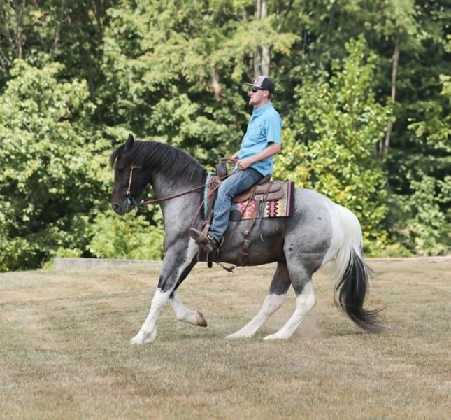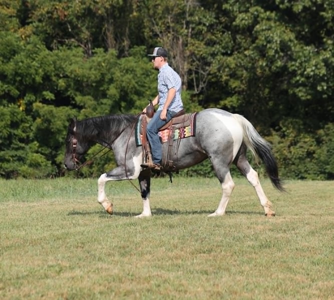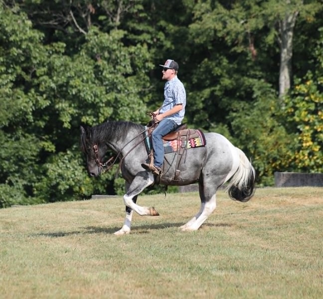 Poncho is as cool as he is different! This draftcross gelding stands around 15.3hh that will weigh around 1400lbs and he is a 5 years old. Poncho is a rare blue roan tobiano!!! Poncho is everyone’s best friend as he loves attention and is very calm natured. He is out of the same breeding program as several other top draftcross geldings that we have had over the last 5 years and every one of them has the right mind with the calm nature that makes them great family horses. Poncho has been ridden by every member of our family all the way down to our 7 year old daughter. He has been ridden down the highways and he is traffic safe as well. Poncho is great on trails and he will cross creeks, ditches, logs and navigate rough rocky areas. He has a smooth jog, a VERY VERY nice easy to set lope and a good stop! He neckreins around and backs with ease. He has been exposed to all kinds of wildlife such as deer or turkey or other animals like cows or dogs and will go anywhere that he is asked too. He has been ridden many miles in the mountains of Eastern Kentucky and encountered every obstacle possible on the trail. He will go up or down even the steepest slopes, across deep creeks, over downed trees, and over all types of rough terrain while still being sure footed. Poncho is not cinchy, cold backed, does not crib or weave. In addition to riding, Poncho has also been worked in farm machinery as well. He is the horse of a lifetime, don’t miss him!!! Feel free to contact me +13039908552