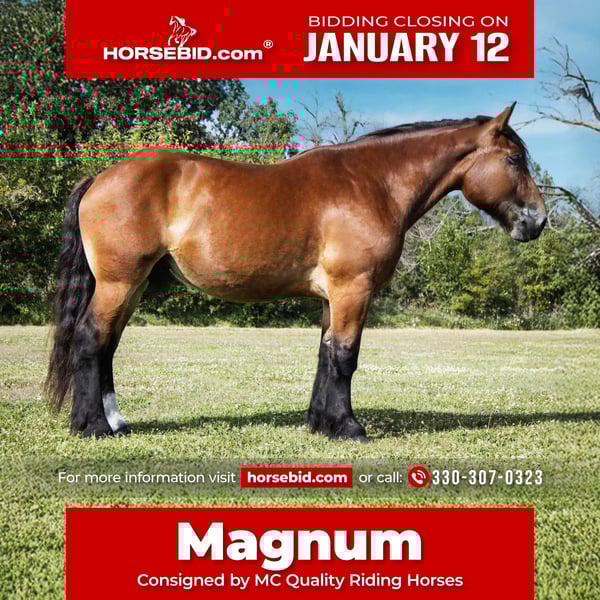 ♦️𝐍𝐄𝐖 𝐘𝐄𝐀𝐑'𝐒 𝑬𝒙𝒕𝒓𝒂𝒗𝒂𝒈𝒂𝒏𝒛𝒂♦️ Happening now thru MONDAY | JANUARY 12th - Available EXCLUSIVELY on HorseBid's website! For more details and to register visit: www.Horsebid.com CONSIGNOR CONTACT: MC Quality Riding Horses 330-307-0323 LOCATION: Battle Creek, IA BREED: Brabant REGISTERED: No REGISTERED NAME: Magnum COLOR: Bay HEIGHT: 16.2 AGE: 5 GENDER: Gelding ✨ Magnum — Stunning 16.2 5 yr old Brabant Bay Gelding ✨ If you’re looking for a big, beautiful, and kind-souled gelding, Magnum stands out in every way. Standing 16.2 hands, he is quiet, gentle, and exceptionally smooth to ride, making him a pleasure for riders of various experience levels. Magnum rides and drives and has extensive trail experience. He is traffic safe, sensible, and steady-minded whether you’re out on the trails, around the farm, or in new environments. He takes everything in stride with an easygoing attitude. ✅ Quiet, gentle, and soft-minded ✅ Very smooth to ride ✅ Rides & drives ✅ Lots of trail miles ✅ Traffic safe ✅ Total love bug personality He is the type that enjoys attention, loves people, and wants to be your partner in whatever you choose to do. Magnum is a true gentle giant with looks, brains, and heart.