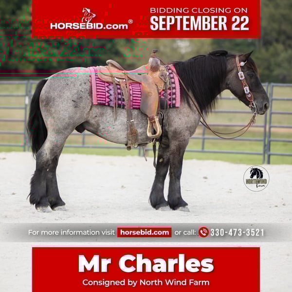 🍁𝒕𝒉𝒆 𝐅𝐀𝐋𝐋 𝑺𝒑𝒆𝒄𝒕𝒂𝒄𝒖𝒍𝒂𝒓🍁 Happening now thru MONDAY | SEPTEMBER 22nd - Available EXCLUSIVELY on HorseBid's website! For more details and to register visit: www.Horsebid.com CONSIGNOR CONTACT: North Wind Farm 330-473-3521 LOCATION: Fredericksburg, OH BREED: Crossbred REGISTERED: No REGISTERED NAME: Mr Charles COLOR: Blue roan HEIGHT: 14.1 AGE: 5 GENDER: Gelding Mr Charles, he is a 5 yr old blue roan crossbred gelding standingn at 14.1hh! Charles is well broke to ride! He has good ground manners, and is easy to get along with! Heh stands good for baths, grooming and tacking up. He will load into the trailer and travel well! Charles loves being turned out in the pasture, and is easy to catch with a treat! He has been to the state parks and he has been on a local trail ride with 500 other horses! He is used to commotion and handles new places well! He is a great trail horse, trust worthy, safe, and has a ground covering walk. Charles will cross all theth obstacles, he doesn’t mind the tarp, and he carries the flag! He will walk over the bridge and stand on the block! He walks through the tarp and the noodles! He is used to being around dogs! He will cross the creeks, he steps over logs, and handles the hills with ease! Charles rides great in the arena, he will pick up both leads, he has a nice stop and back up! He will neck rein and move off of leg pressure! He will ride western, bareback, and bridles! He has the most flowly canter and easy transitions! He will do a 360 in the box and and back up through the poles! He has a nice side pass and pivot! He is so fun to ride, and he laydown as well as sitting down! Charles is willing, he learns fast and is a lot of fun to be around! He is 100% sound and healthy! Contact us for more info or too make an appointment to meet him! ⭐️North Wind Farm is renowned for its quality trail and all-around horses. Our horses are versatile and can excel in any discipline, making them perfect for riders of all levels. Whether you're looking for a reliable trail companion or a horse that can perform in various disciplines, North Wind Farm has the perfect match for you. Our commitment to excellence and passion for equine care ensures that each horse is well-trained, healthy, and ready to meet your needs. Contact us @ Tim (330)600-8840 Lisa (330)473-3521