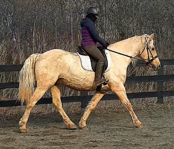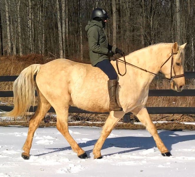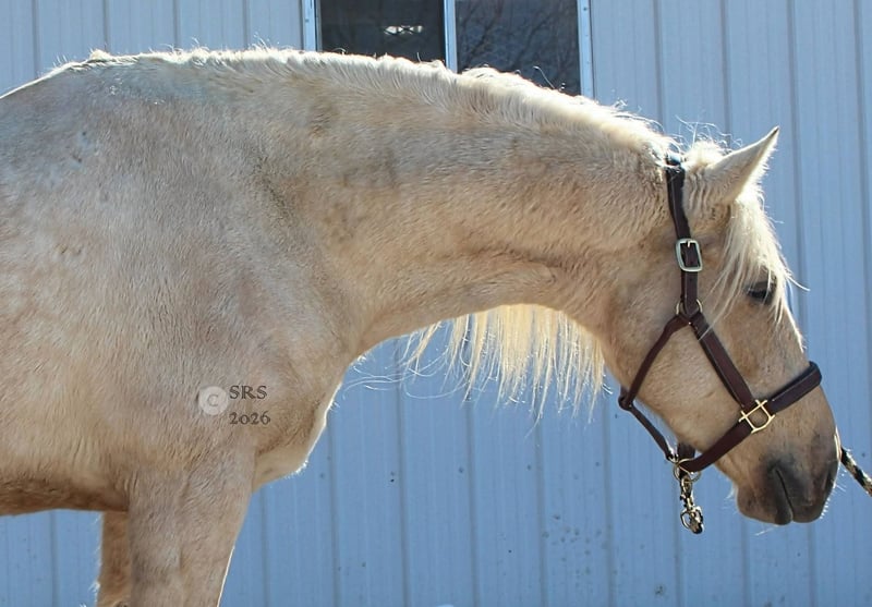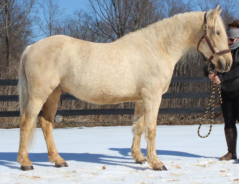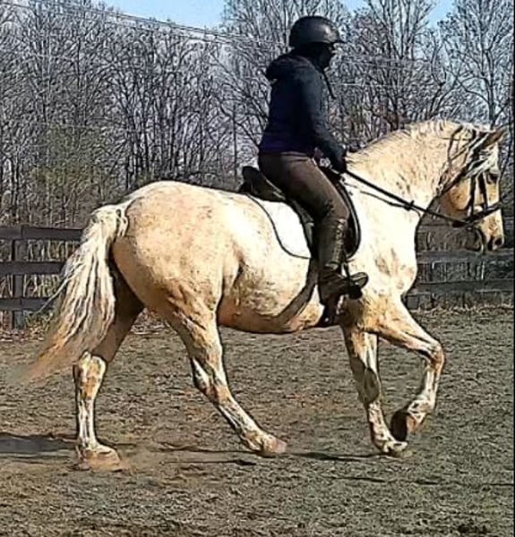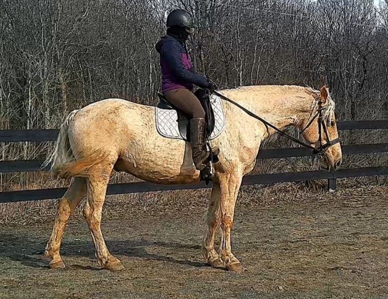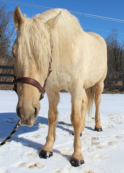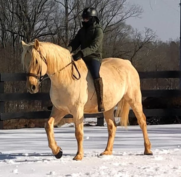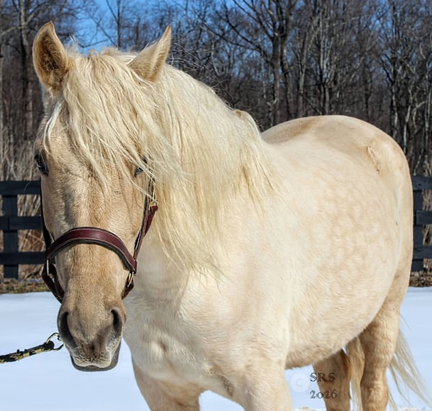 "AVAILABLE ON ONLINE HORSE AUCTION AT www DOT MagicHorseAuction DOT com BIDDING OPEN NOW thru TUESDAY | MARCH 17TH! BUY IT NOW AVAILABLE! *Final price will be determined on auction site* CONSIGNOR CONTACT INFO:Nicole Ingrassia #571-289-2947 LOCATION: Jeffersonton, VA" "Are you looking for the ultimate dream horse? Meet Mellow Yellow! Mellow is a spectacular and rare cream-colored 6 year old draft cross gelding with long, naturally wavy mane and tail, and a stunning creamy golden coat that dapples out to create a unique dappled palomino color. His hair is naturally thick and wavy all on its own, with a cascading forelock that reaches his noseband and a wavy tail that glistens off the sun even in the drab grey of winter. He stands approx. 15.3H with a thick & correct build yet he is light on his feet and agile particularly for a draft cross. If his looks aren't enough to completely captivate you, zoom your gaze out to take in his correct build, sporting large, sturdy, strong bare feet that don't require shoes, even when we have trail ridden him over rocks, mud, snow, and ice and on paved and unpaved roads. Check out his long, beautifully arched neck, wide chest, strong hind end, straight legs, sporty shoulder and total absence of any notable blemishes. Meet his kind, warm brown eyes, affectionately poking out from behind his wavy forelock, eager to greet you like man's best friend and happy to go on the adventures you have planned for that day. Then look at him in motion - check out his flatkneed trot with its beautiful reach, the ease of sitting it because it is so smooth and comfortable and, well, easy! Posting is optional and his trot is very easy on your back, so easy even a 5 year old child can sit his trot with no stirrups (please see video). Check out the same for his canter, how it rolls from the hind end and is so easy, pleasant, rhythmic and idyllic. The icing on this horse cake is that Mellow has a loving, goofy, fun personality, and an unflappable type nature, making him the perfect all-arounder for a multitude of jobs and a fun horse to be around and spend time with. All in all, Mellow is a quality specimen who also possesses an undeniably unique, gorgeous look that stands out among the most discerning and distinguished of standards, while he also has an ""every day"" attitude that fits a horse suitable for many different people and families. In other words, Mellow can be your fancy show horse OR your lifelong family horse, or your horse to enjoy your golden days of retirement with, or your returning to riding and need a sane buddy horse, or a foxhunting partner, or, what can you think of? Because Mellow is very versatile and possesses brains, beauty, talent, and personality all wrapped up in one horse. Dress him up or dress him down, he is suitable for a wide variety of things and is a happy-go-lucky calm-minded heart throb. Mellow is very true to his name and possesses a calm and steady temperament. I have never once seen him buck or rear and he is not a spooky type of horse. In fact, during the great icing of this past winter, Mellow was up in the barn for most of the month due to the icing of his hilly pasture. After having almost 3 weeks off and being cooped up in subfreezing temperatures, when most horses would be losing their mind, his very first ride back I rode him bareback in the snow (as seen on video). To say he needs no lungeing or prep is an understatement, in my opinion. He was also ridden by small children around that time. Despite his steady, calm temperament, Mellow is no plug when asked to work, and he will happily jump fences, hack out, and moves off the leg nicely and smoothly and seems to enjoy dressage as well. Mellow loves to jump and is a total natural over fences, and has jumped a variety of fences both inside and outside the arena. He would make the most amazing fox hunting horse or trail rider, dressage horse, event horse, or really suit a wide variety of athletic disciplines or be content to be a beautiful & cherished family horse. If you are looking for a horse that possesses both brains AND rare beauty, he is just the ticket you've been waiting for. Mellow has a great start in a broad manner (western, jumping, dressage basics, kids riding, trails both alone & in company, exposed to flags, whips, tarps, bouncy balls, long lines/ground driving, XC jumping, bareback, crosses water, riding double, ships around with ease, etc.) so he can continue in any direction you choose -- he has the brains, beauty and the talent -- to make that winning combination. Mellow is very friendly and absolutely loves any attention he can get. He is very much ""in your pocket"" with a willing to please disposition and not a mean bone in his body. He radiates kindness and is a horse any family would be proud to call their own. He is well-behaved for the vet & farrier. He is easy to have around the barn & farm, he is happy to be turned out or in a stall. He has no vices and no stall vices and he is not overly messy in his stall. He is not on grain as we choose to not grain our horses unless they need it. He gets a ration balancer for vitamins. He gets along well with both mares and geldings in turn out. He gets free choice hay and is easy to have around, comes up to you in the pasture and has not displayed herd bound behaviors. He loads onto a trailer without issue. He stands nicely to be bathed and picks up all his feet. We have not noticed any ""quirks"" while handling him and he is used to kids, dogs, chickens, tractors, ATVs, cats, and cows, etc. Mellow is not on any maintenance and is UTD on vaccines, dental, coggins, deworming & farrier. His age of 6 years old is verified by vet & equine dentist. Mellow is eligible for registry with the American Warmblood Society & Sporthorse Registry if his new owner desires. He has no health or soundness issues and is 100% sound and healthy with no notable scars, blemishes, or prior injuries. As a courtesy, he has a recent vet exam 