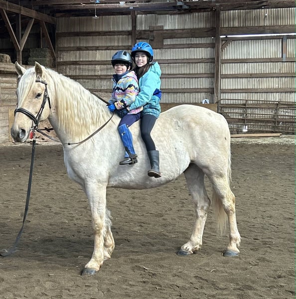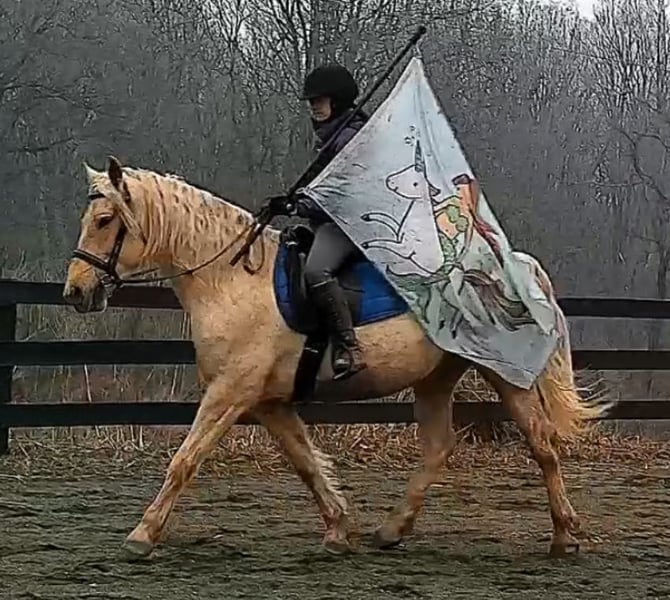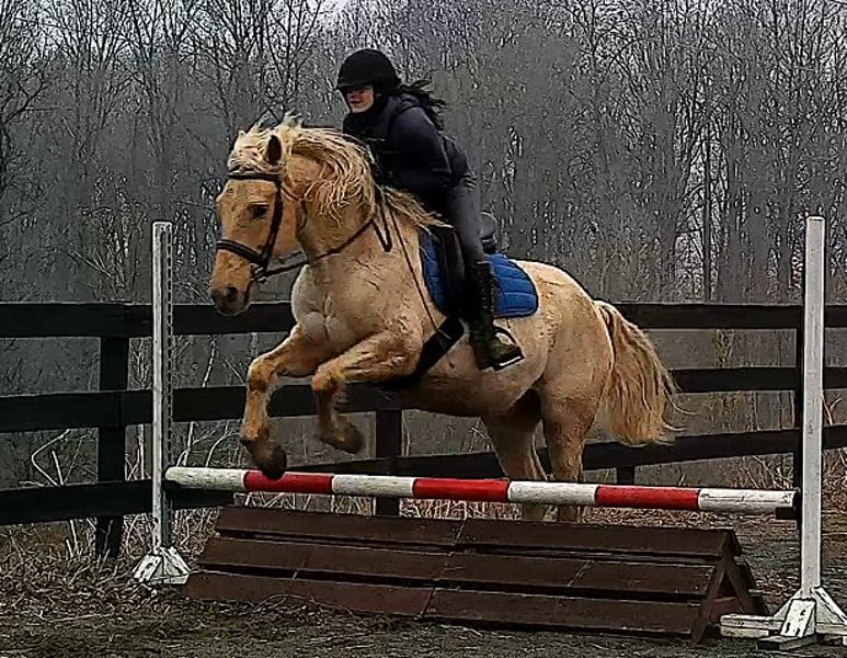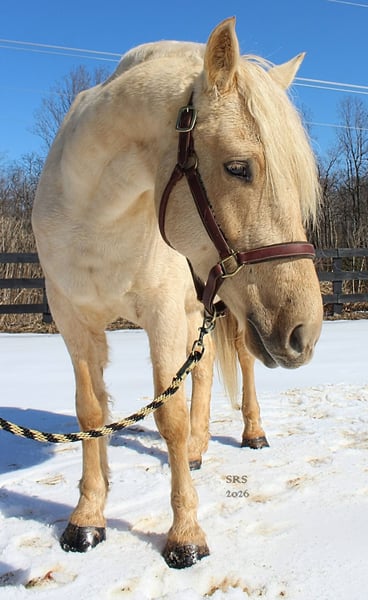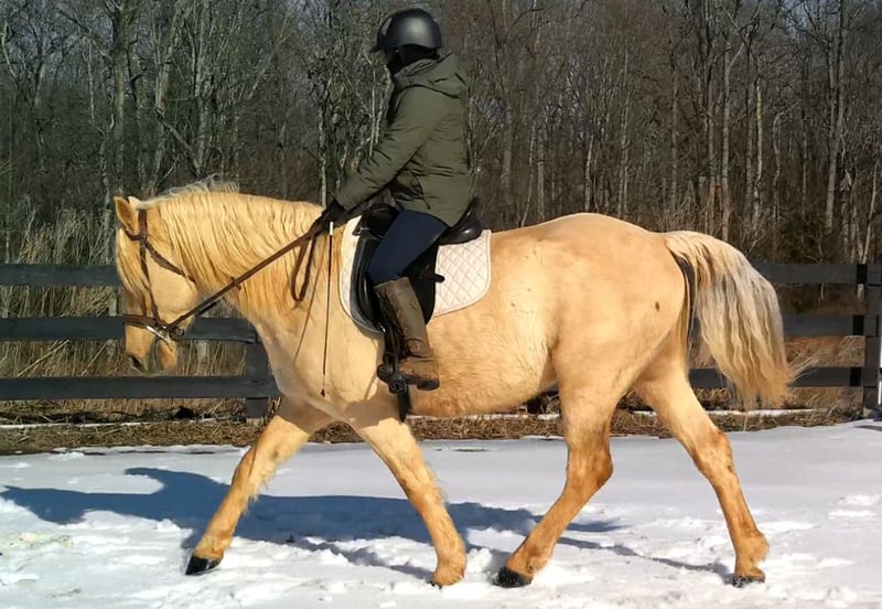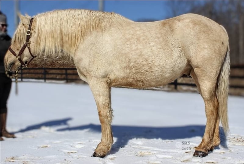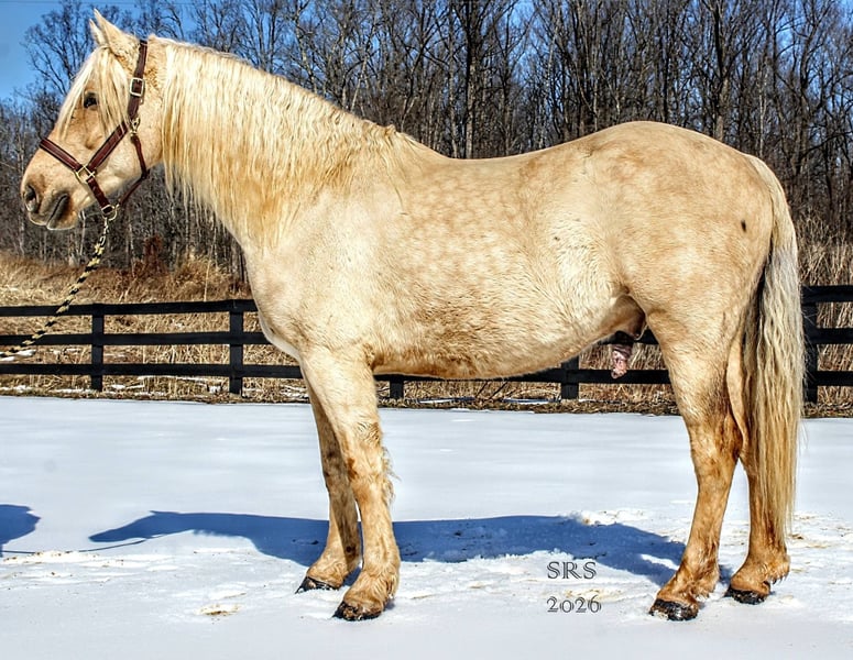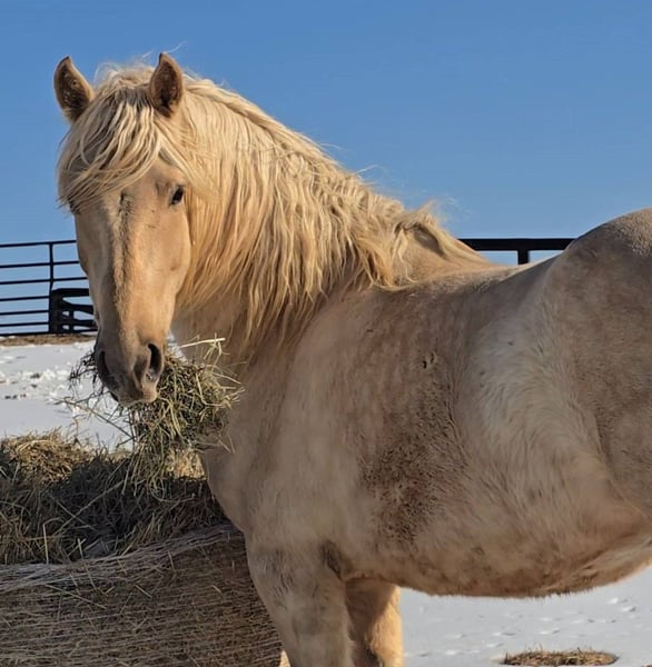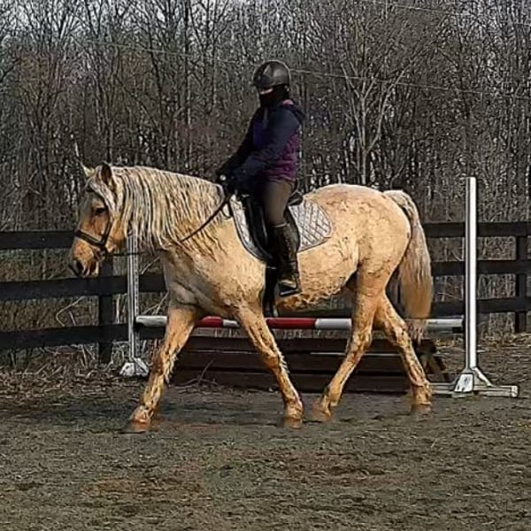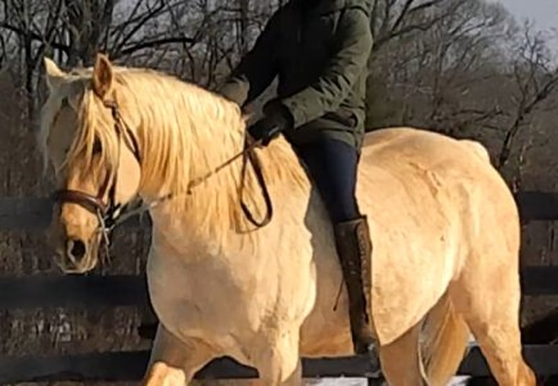 "AVAILABLE ON ONLINE HORSE AUCTION AT www DOT MagicHorseAuction DOT com BIDDING OPEN NOW thru TUESDAY | MARCH 17TH! BUY IT NOW AVAILABLE! *Final price will be determined on auction site* CONSIGNOR CONTACT INFO:Nicole Ingrassia #571-289-2947 LOCATION: Jeffersonton, VA" "Are you looking for the ultimate dream horse? Meet Mellow Yellow! Mellow is a spectacular and rare cream-colored 6 year old draft cross gelding with long, naturally wavy mane and tail, and a stunning creamy golden coat that dapples out to create a unique dappled palomino color. His hair is naturally thick and wavy all on its own, with a cascading forelock that reaches his noseband and a wavy tail that glistens off the sun even in the drab grey of winter. He stands approx. 15.3H with a thick & correct build yet he is light on his feet and agile particularly for a draft cross. If his looks aren't enough to completely captivate you, zoom your gaze out to take in his correct build, sporting large, sturdy, strong bare feet that don't require shoes, even when we have trail ridden him over rocks, mud, snow, and ice and on paved and unpaved roads. Check out his long, beautifully arched neck, wide chest, strong hind end, straight legs, sporty shoulder and total absence of any notable blemishes. Meet his kind, warm brown eyes, affectionately poking out from behind his wavy forelock, eager to greet you like man's best friend and happy to go on the adventures you have planned for that day. Then look at him in motion - check out his flatkneed trot with its beautiful reach, the ease of sitting it because it is so smooth and comfortable and, well, easy! Posting is optional and his trot is very easy on your back, so easy even a 5 year old child can sit his trot with no stirrups (please see video). Check out the same for his canter, how it rolls from the hind end and is so easy, pleasant, rhythmic and idyllic. The icing on this horse cake is that Mellow has a loving, goofy, fun personality, and an unflappable type nature, making him the perfect all-arounder for a multitude of jobs and a fun horse to be around and spend time with. All in all, Mellow is a quality specimen who also possesses an undeniably unique, gorgeous look that stands out among the most discerning and distinguished of standards, while he also has an ""every day"" attitude that fits a horse suitable for many different people and families. In other words, Mellow can be your fancy show horse OR your lifelong family horse, or your horse to enjoy your golden days of retirement with, or your returning to riding and need a sane buddy horse, or a foxhunting partner, or, what can you think of? Because Mellow is very versatile and possesses brains, beauty, talent, and personality all wrapped up in one horse. Dress him up or dress him down, he is suitable for a wide variety of things and is a happy-go-lucky calm-minded heart throb. Mellow is very true to his name and possesses a calm and steady temperament. I have never once seen him buck or rear and he is not a spooky type of horse. In fact, during the great icing of this past winter, Mellow was up in the barn for most of the month due to the icing of his hilly pasture. After having almost 3 weeks off and being cooped up in subfreezing temperatures, when most horses would be losing their mind, his very first ride back I rode him bareback in the snow (as seen on video). To say he needs no lungeing or prep is an understatement, in my opinion. He was also ridden by small children around that time. Despite his steady, calm temperament, Mellow is no plug when asked to work, and he will happily jump fences, hack out, and moves off the leg nicely and smoothly and seems to enjoy dressage as well. Mellow loves to jump and is a total natural over fences, and has jumped a variety of fences both inside and outside the arena. He would make the most amazing fox hunting horse or trail rider, dressage horse, event horse, or really suit a wide variety of athletic disciplines or be content to be a beautiful & cherished family horse. If you are looking for a horse that possesses both brains AND rare beauty, he is just the ticket you've been waiting for. Mellow has a great start in a broad manner (western, jumping, dressage basics, kids riding, trails both alone & in company, exposed to flags, whips, tarps, bouncy balls, long lines/ground driving, XC jumping, bareback, crosses water, riding double, ships around with ease, etc.) so he can continue in any direction you choose -- he has the brains, beauty and the talent -- to make that winning combination. Mellow is very friendly and absolutely loves any attention he can get. He is very much ""in your pocket"" with a willing to please disposition and not a mean bone in his body. He radiates kindness and is a horse any family would be proud to call their own. He is well-behaved for the vet & farrier. He is easy to have around the barn & farm, he is happy to be turned out or in a stall. He has no vices and no stall vices and he is not overly messy in his stall. He is not on grain as we choose to not grain our horses unless they need it. He gets a ration balancer for vitamins. He gets along well with both mares and geldings in turn out. He gets free choice hay and is easy to have around, comes up to you in the pasture and has not displayed herd bound behaviors. He loads onto a trailer without issue. He stands nicely to be bathed and picks up all his feet. We have not noticed any ""quirks"" while handling him and he is used to kids, dogs, chickens, tractors, ATVs, cats, and cows, etc. Mellow is not on any maintenance and is UTD on vaccines, dental, coggins, deworming & farrier. His age of 6 years old is verified by vet & equine dentist. Mellow is eligible for registry with the American Warmblood Society & Sporthorse Registry if his new owner desires. He has no health or soundness issues and is 100% sound and healthy with no notable scars, blemishes, or prior injuries. As a courtesy, he has a recent vet exam 
