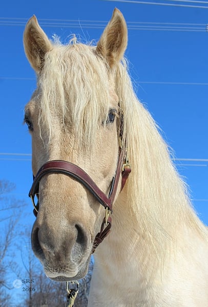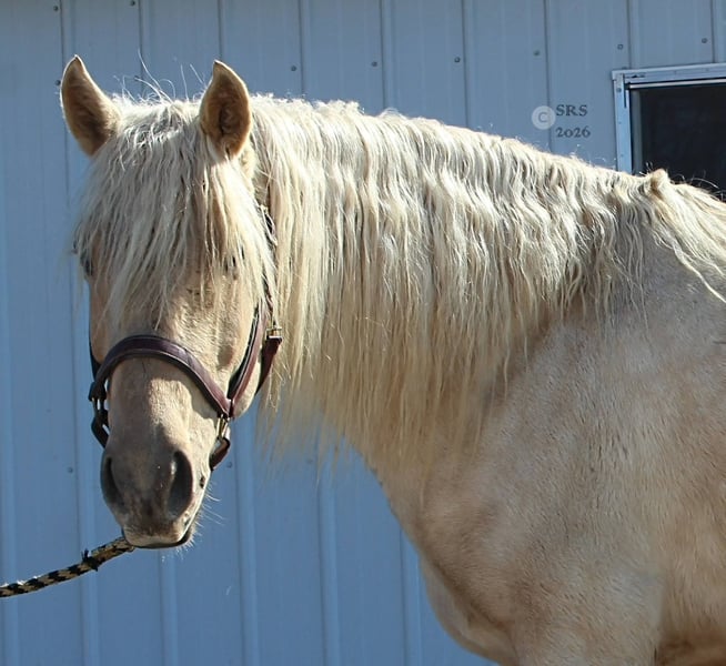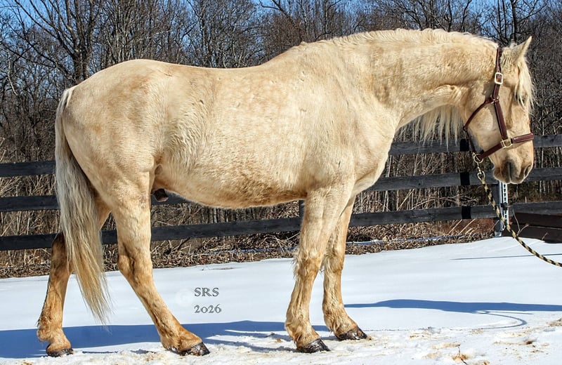 Mellow is een spectaculaire en zeldzame crèmekleurige draft van 6 jaar oud.