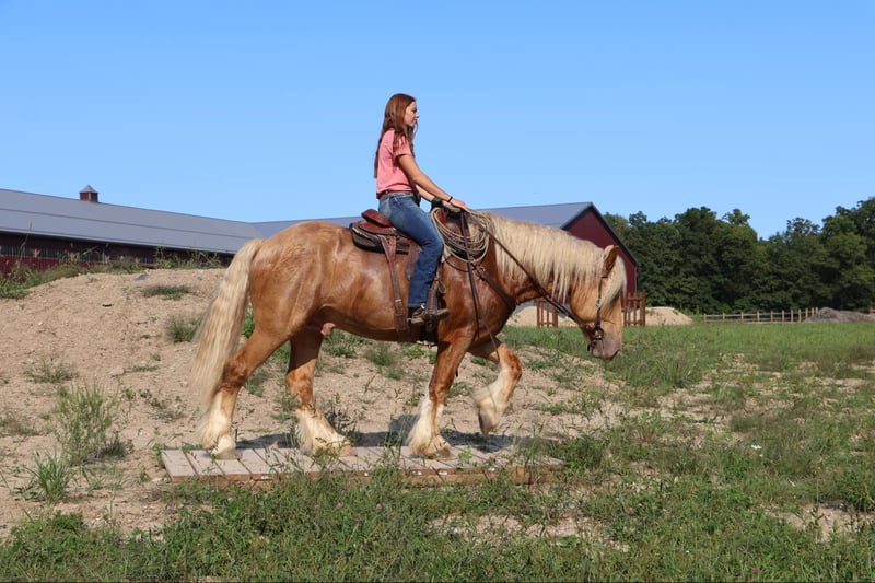 ONLINE AUCTION Place your bids at www.PlatinumEquineAuction.com Starting Bid $3500 Auction ends September 29th, 2024 Need a new saddle? Check out White Rock Saddles on our website or Facebook! Blackstones Golden Boy, or Sargent as we call him around the farm is the kind of horse that turns heads wherever he goes. This stunning 4-year-old, 16.2hh champagne colored American Cream Gypsy Vanner cross gelding is not just a remarkable sight. He shines like pure gold in the sun and has a gorgeous blonde mane and tail. he is a powerhouse of strength, versatility, and athleticism. For a horse of his size, Sargent moves with incredible grace and fluidity, making him not only a reliable mount but also an athlete in his own right. Whether you are riding Western, English, or bareback, Sargent delivers an exceptional experience, seamlessly transitioning between disciplines with ease. What truly makes Sargent stand out is his “been there, done that” attitude. He is the definition of a bombproof horse—absolutely safe in any environment. Sargent has been ridden on state roads, in the woods, open fields, and has even gone on a shopping trip to our local farm store! His beautiful golden color blonde mane and tail and flowing feathers capture everyone’s attention! One glance into his big hazel eyes will steal your heart. Out on the trails, Sargents calm, and steady nature shines. Water crossings, tarps, bridges and other common obstacles do not phase him in the slightest. His even temperament makes him an ideal horse for beginners who need a forgiving partner, while his experience and smooth gaits make him just as enjoyable for advanced riders. Sargent is the rare horse that adapts to his rider’s needs, making him a perfect fit for anyone from novice to seasoned equestrians. And speaking of smoothness, Sargents three gaits are simply unbeatable. His walk, trot, and canter are incredibly fluid and comfortable, making him perfect for all-day rides without leaving you sore. Whether you are working in the arena or exploring the trails, Sargents athleticism and stamina ensure he will keep going strong, mile after mile. In short, Sargent is the full package: strikingly beautiful, strong, athletic, and most importantly, safe. If you are looking for a versatile horse that excels in both riding and driving, Sargent is the perfect partner. He is ready to take on anything, whether you are a beginner looking for safety or an experienced rider seeking a smooth, dependable horse for long adventures. Sargent lives in Howell, MI 48855. Please call or text Ellesse Schwartz at 248-390-6831 for more information. ONLINE AUCTION Place your bids at www.PlatinumEquineAuction.com Starting Bid $3500 Auction ends September 29th, 2024 Need a new saddle? Check out White Rock Saddles on our website or Facebook!