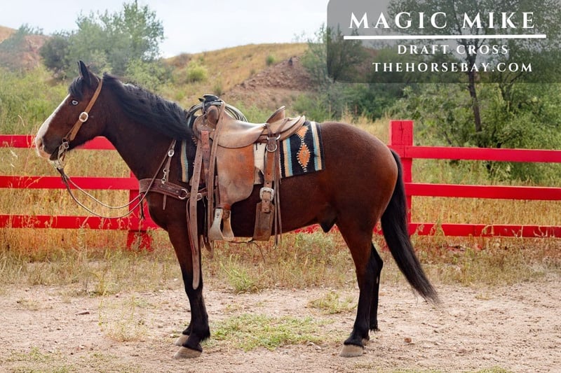 Magic Mike ist ein 6-jähriger Kaltblut-Mischlingshengst. Mit einer Größe von 14 Händen ist dieser Kerl wie ein Panzer gebaut und trägt Eisen in Größe eins. Er ist robust und kann den ganzen Tag in unwegsamem Gelände gehen, selbst mit einem großen Reiter. Er hat Rinder gefangen und geführt, Kälber gezogen und sowohl Kopf- als auch Fersenrinder geritten. Er weiß, was Arbeit ist, bleibt auch nach Pausen sanft, solange es keine lustigen Spielereien gibt. Mike wäre auch ein großartiges Trailpferd.