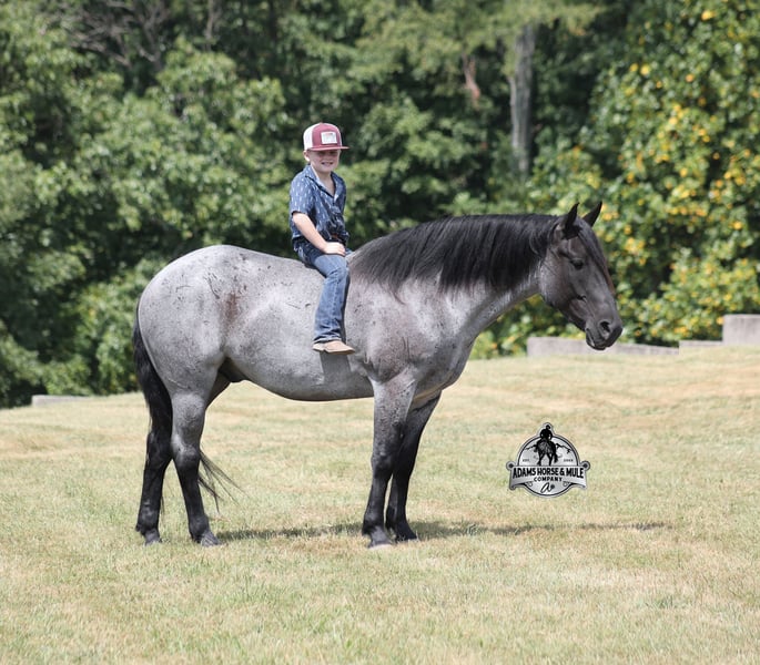 Go to visit our website for more pics and a video www.AdamsHorseAndMuleCo.com AHAMC has been in the horse business and sold horses over the internet since 2005. We have a long track record of success with hundreds of happy customers. We work hard to match riders with the correct horses and specialize in beginner safe, family friendly horses that have been used and checked out by our family! We can set up transportation anywhere in the US and look forward to working with you. Hondo is a rare TRUE BLUE ROAN Draftcross gelding! He is coming 6 years old and is a very stocky built horse. Hondo came from the same breeding farm that a lot of our draftcrosses come from and with that farm we find the constant quiet, gentle, laid back temperament that makes them such good family safe trail horses! Hondo is no exception to that statement as he is a super quiet, gentle, laid back type of horse that is going to suit any rider. Not to mention he is very friendly as well! Hondo can do a variety of things from pulling carriages, to ranch work or trail rides. He has been on camping trips, been ridden in several states and has been ridden by all ages of beginners. When out on the ranch or going down the trails he will cross creeks, ditches, logs and navigate rough rocky areas. He is safe in traffic safe whether that be trucks or cars. He’s been ridden around the ranch, checked cows and rode fences. Hondo moves very smoothly, as he has a nice jog, his lope is smooth as well and he lopes nice circles on a loose rein! Hondo is blue but he will never make you blue and he is sure to be your new best friend! Feel free to call Eric 606-308-2461 with any questions!