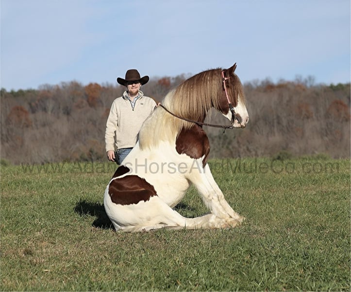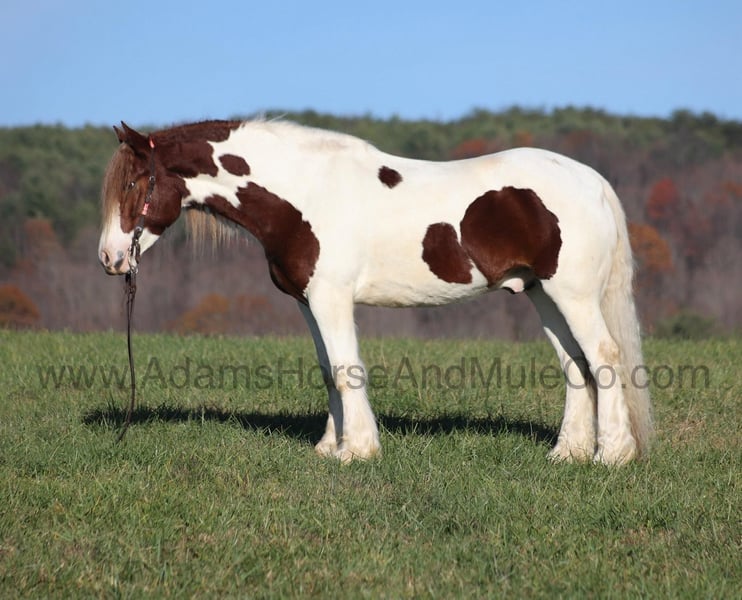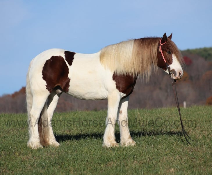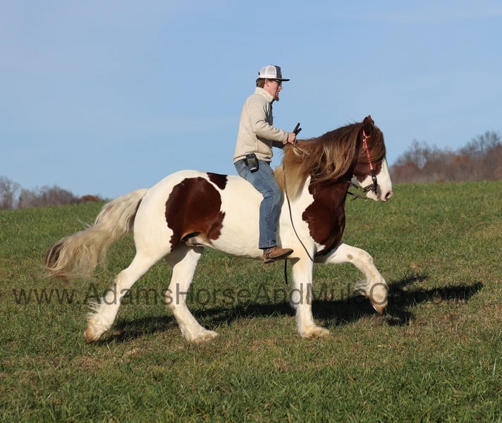 Go to visit our website for more pics and a video. AHAMC has been in the horse business and sold horses over the internet since 2005. We have a long track record of success with hundreds of happy customers. We work hard to match riders with the correct horses and specialize in beginner safe, family friendly horses that have been used and checked out by our family! Valadium Pride aka Val is a stout built registered Gypsy Horse gelding that is standing around 15.2hh. He will weigh 1250lbs, he is a 2018 model and he has all the good looks, the feathering and (the best part) the mindset that anyone could ask for! Not only does he look cool, he has all of the other boxes checked as well… he is Mr. Personality, as friendly as they come, loves attention and is very calm natured. Val is out of the same breeding program as several other top draftcross geldings that we have had over the last 4 years and every one of them has the right mind with the calm nature that makes them great family horses. Val has been with us since last year and has completed the natural horsemanship training and has done liberty work and he also knows some tricks as he will bow, lay down and set on his rump. Val has been ridden by every member of our family all the way down to our 6 year old daughter. He has been ridden down the highways and he is traffic safe as well. Val is great on trails and he will cross creeks, ditches, logs and navigate rough rocky areas. He has a smooth jog, a VERY VERY nice easy to set lope, a good stop, turns a circle both ways and backs with ease! He has been exposed to all kinds of wildlife such as deer or turkey or other animals like cows or dogs and will go anywhere that he is asked too. He has been rode many miles in the mountains of Eastern Kentucky and encountered every obstacle possible on the trail. He will go up or down even the steepest slopes, across deep creeks, over downed trees, and over all types of rough terrain while still being sure footed. Val is not cinchy, cold backed, does not crib or weave. In addition to riding, Val has also been driven down the highways as well. Val is a super cool horse that anyone is sure to love!!! Feel free to call Eric 606-308-2461 with any questions.
