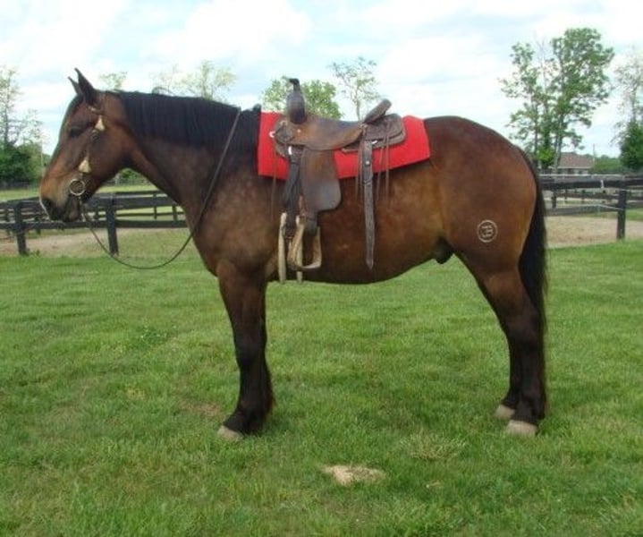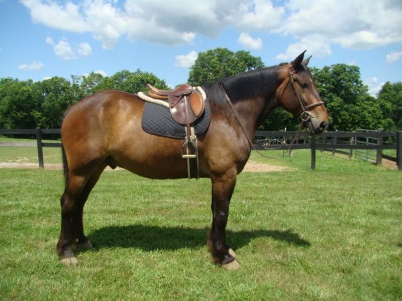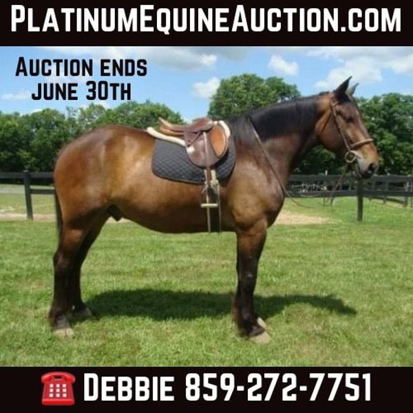 ONLINE AUCTION PLACE YOUR BIDS AT PLATINUMEQUINEAUCTION DOT COM $3500 STARTING BID AUCTION ENDS JUNE 30TH Moose is one big guy standing at 17.1 hands and a 7 yr old draft cross gelding. Moose has an awesome personality and loves attention and being loved on. He is easy to catch and handle. Moose will stand quietly at the mounting block and has a beautiful walk, trot and canter. He is not a forward guy but will do what is asked of him. He also has been jumped over cross rails and some verticals, he is a willing guy and tries hard to please. While he has spent the majority of his life as a trail horse, he loves arena work as well. He is an awesome trail horse and will cross water and logs with ease. He would be the perfect lesson horse or addition to anyone’s family. Moose is the same horse whether you ride him six days a week or one day a week. He is a barn favorite! Contact Debbie Greer 859-272-7751 Located in Lexington, KY.