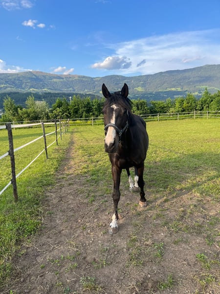 Shadow is a well-behaved, 18-year-old Warmblood mix mare. She has no vices such as biting or rearing and is always very motivated when working. I still ride her for leisure, but she is not suitable for beginners. Shadow needs a rider who can provide her with security. In the summer, she shows slight "headshaking," which is manageable even while riding. I wish for her to have a calm place and a patient person who enjoys spending time with her. If interested, please contact: Tel.: +43 676 9433416 Email: lena.schuetzinger@gmail.com