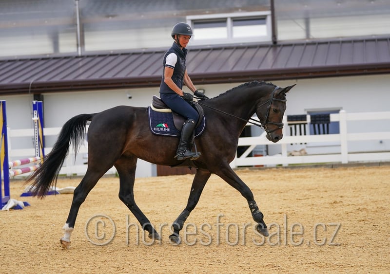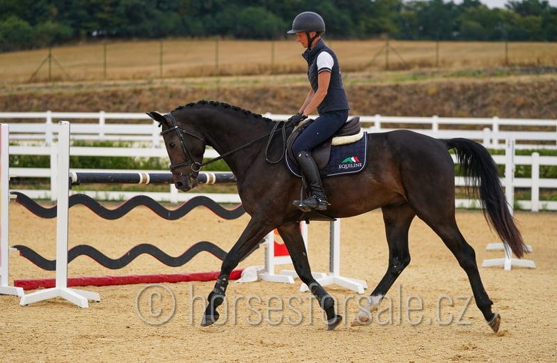 SISCO - eye-catcher for all rings, amazing jump Sisco is a real eye-catcher with flashy jump and outstanding movement. He is competing in show jumping ring on 100/110 level so far, but has enough scope for higher classes in the future, would perfectly suit for equitation ring as well. He is not looky or spooky, has nice lead changes, is not afraid of a bigger jump and behaves on a new place like at home. Easy to handle, travel etc., correct and sound (x-rays available). His mother was successful in parcour up to MT 1.40 with a girl. Price: 30.000€, More information or videos under +420602862723 https://youtu.be/YyRbo6vIcQA https://youtu.be/SPQFfUOKBQQ https://youtu.be/GxFVicIpsEw https://youtu.be/ffH3bY37Uag Born: 2021, Height: 169 cm, Pedigree: Codarco (Cornet Obolensky) x Silvio II Location: 1 hour from Prague, transport can be provided. *** more horses on my website www.horsesforsale.cz **
