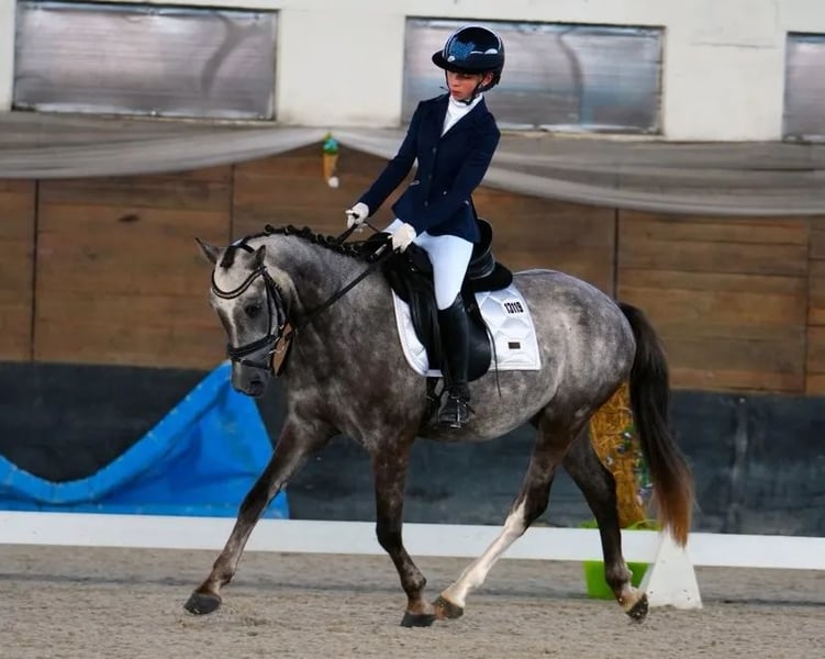 Willing, pleasant and reliable. He has a lovely temperament, enjoys working and is very easy to ride, making him ideal for children as well as less experienced riders. He gives confidence in the saddle and makes every ride an enjoyable experience. ✔️ Suitable for children ✔️ Easy to ride ✔️ Experience in dressage and show jumping He has competition experience in both dressage and show jumping. In training, he comfortably jumps courses up to 100 cm and shows nice potential for the future. He is easy to care for, well-behaved in daily handling and safe to ride in the field. Ridden by children, with a very reliable character. A great choice for a rider looking for a safe, talented pony for both sport and everyday enjoyment.