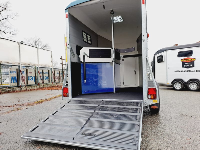 We are selling a new Böckmann Portax SKA (22) in a new design **** special color ocean-green **** - new design - more space - more interior height - 2 years Tüv free from first registration!!! - permissible total weight: 2400 kg - Payload: 1300 kg - Interior width: 175 cm - Interior length: 356 cm - Interior height: 235 cm - WCF chassis (independent suspension) 100 km/h, - Böckmann Premium aluminum rims 14" - Rear flap hinged door combination - hinged on the side, - Tack room accessible from outside and inside - Saddle holder can be rotated and swiveled - Center post partition can be swiveled at the front and rear, - Side step protection, - side padding, - Sliding side window, - Roof window, - panorama window at the front, - 1 x large entrance doors - Tarpaulin lift - Automatic support wheel - Price incl. VAT more new and used horse trailers in stock! Vehicle registration documents can be sent for registration for a €5 surcharge in advance! Delivery by arrangement, trade-in and financing possible Inspection/collection in 16845 Großderschau possible at any time by arrangement on 033875-909588! Opening hours: Monday - Friday 8.00 - 17.00 o'clock