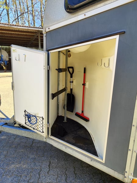 Se pone a la venta un remolque usado para 2 caballos del tipo Böckmann Duo Esprit CG, del primer propietario. El remolque ha sido utilizado muy poco y ha estado almacenado en un cobertizo abierto y seco para maquinaria agrícola. Está en buen estado tanto técnico como visual, por lo que está listo para su uso inmediato. Datos técnicos: • Fabricante: Böckmann • Modelo: Duo Esprit CG • Primera matriculación: 04/05/2017 • Inspección técnica válida hasta: 10/2027 • Capacidad máxima autorizada: 2.000 kg • Peso en vacío: 856 kg • Dimensiones interiores: 3100 x 1650 x 2300 mm • Aprobación para 100 km/h • Chasis CFF-Plus con eje en V atornillado • Amortiguadores de impacto en las ruedas, freno de arrastre mecánico, rueda de apoyo automática Construcción: • Estructura de contrachapado recubierta de plástico (color granito) y suelo de contrachapado • Tapa de poliéster plateada con 2 ventanas tintadas • 2 barras laterales traseras, 4 bisagras de la puerta trasera, guardabarros individual, dispositivo de elevación con amortiguador de gas, escalón en la puerta trasera, sistema de elevación de lona Interior: • Suelo de goma pegado y sellado • Goma en la compuerta de carga con banda de apoyo • Sistema de soportes de cajas de seguridad con cadenas • Separador transparente de PVC sin parte superior de PVC • Iluminación interior • Cámara inalámbrica para monitorizar el interior • Cuarto de sillas • Soportes adicionales para barras en la caja para ponis El remolque se vende en el estado en que se encuentra, por lo que se excluye cualquier responsabilidad por defectos. Como venta privada, también quedan excluidos la devolución, la garantía y la responsabilidad por vicios ocultos. La entrega del remolque se realiza en 63543 Neuberg. El pago debe efectuarse en efectivo.