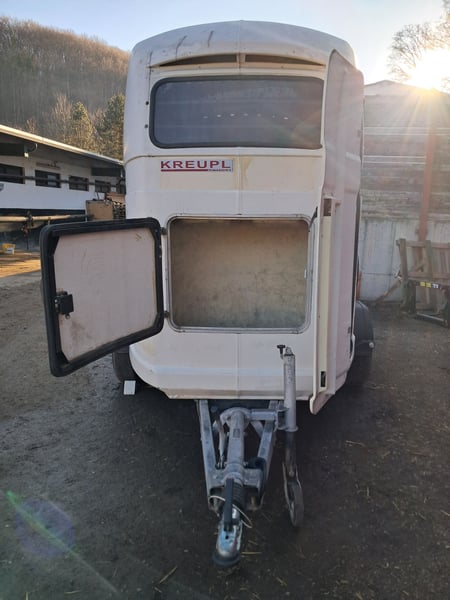 For sale due to new acquisition Poly trailer Westfalia Jupiter white tare weight 870kg maximum permissible total weight: 2000kg Robust partition wall, completely removable Side padding (also on the partition wall) Padded bars Tack room front access Large service door on the front left glued rubber floor Entrance ramp with rubber and step strips EZ 08/2001 Floor, tires and brake cables new in 2020.