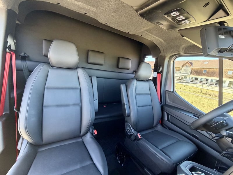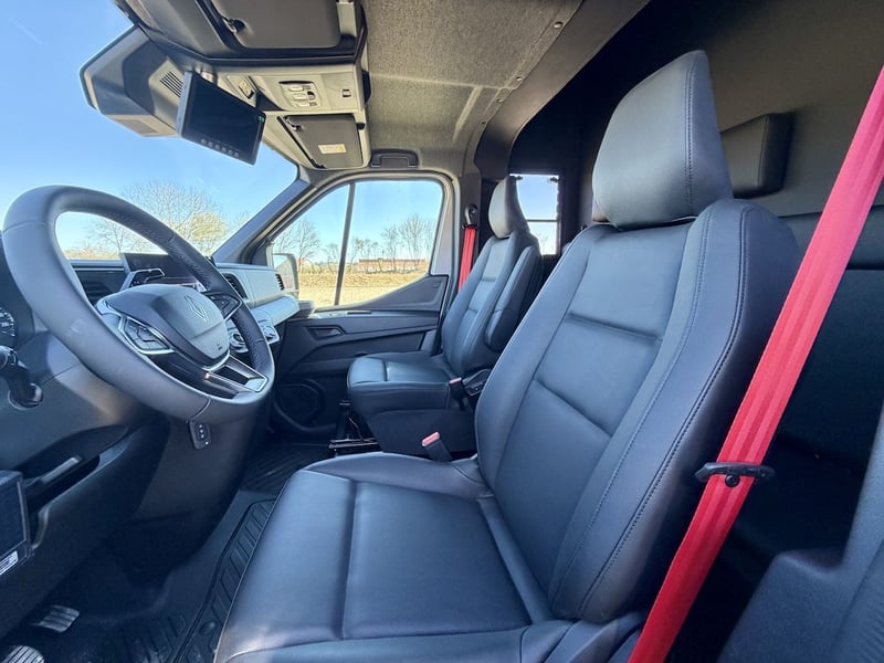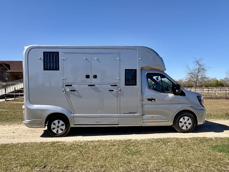 2-Horse Transporter with Stallion Equipment and Automatic Transmission – 5-Seater New model of the Renault Master with 170 HP, 9-speed automatic transmission, five seats, onboard computer, multimedia system with Bluetooth connectivity – Apple CarPlay/Android Auto, navigation system, cruise control, and speed limiter, trailer hitch with a 2,500 kg towing capacity, and more. Horse Compartment • Sturdy, lightweight construction with insulated roof profile • Wide side ramp with low entry and lift-up door • Horse area for up to two horses • Movable partition system • Two pivoting doors in the horse compartment – each horse accessible individually via saddle chamber • Impact protection padding on the rear wall • Two electric roof fans – switchable from the driver’s cab • Day and night lighting controllable from the driver’s cab (white and blue) • Large roof window and two side windows with protective covers • Monitor for video surveillance of the horse area and reverse camera • Saddle chamber with bridle hooks and adjustable saddle rack • Soft, durable, waterproof rubber flooring • 16" all-season tires Additional Equipment • Stallion package with grille enclosure and fully enclosed head doors • Stainless steel grille • Leather seats • Metallic paint finish Further information and pictures are available upon request at any time. Subject to prior sale and errors excepted.