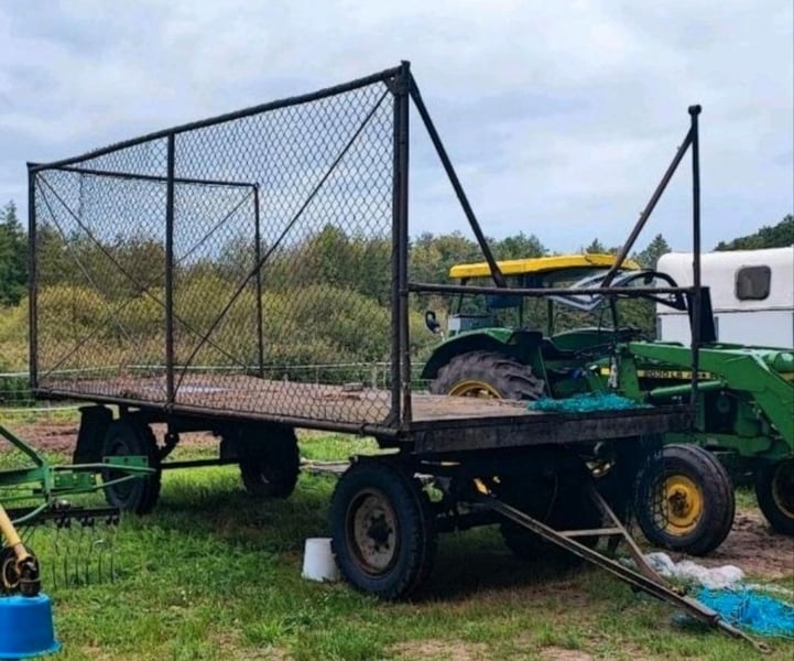 Hallöchen, wir verkaufen hiermit unseren Traktoranhänger. Die Ladefläche hat eine Länge von 5,50 m und die Breite beträgt 2,50 m. Der Anhänger verfügt über eine Auflaufbremse. Papiere gibt es nicht. (25km/h) Wir haben im letzten Jahr alle vier Reifen komplett erneuert, inklusive Wulstband + eine Felge. Die Deichsel hat einen leichten Knick auf einer Seite welcher die Fahreigenschaft nicht beeinträchtigt. In unserem Besitz wurde er regelmäßig gefettet. Das Untergestell haben wir, so gut es ging, mit korrosionsbeständigen Lack behandelt. Die Platte ist aus Stahlblech. Bei Interesse einfach melden. MfG Deborah Reschke