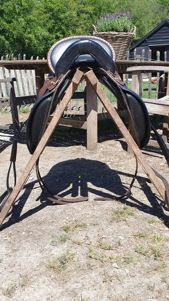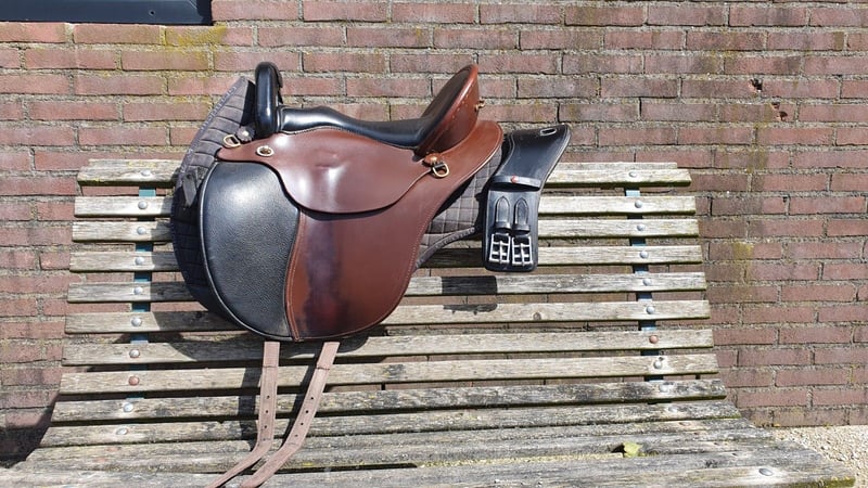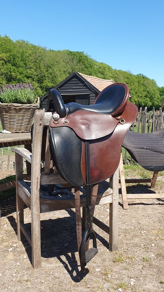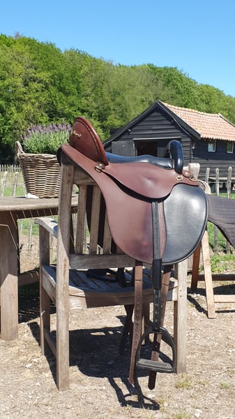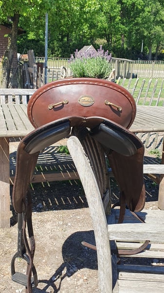 Prachtig stoer boomloos zadel in tweekleurig leer, met de hand gemaakt. Startrekk comfort maat S1 met verstelbaar voorboogje (Delphin). Inclusief Grandeur dekje met inlages en anatomisch gevormde singel. Ophalen in Doorn of Driebergen