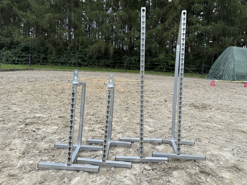Proponujemy przeszkody jeździeckie, które są połączeniem stabilnej konstrukcji, precyzji wykonania i estetycznego wyglądu. Dostępne wykończenia: – stal ocynkowana – odporna na korozję i warunki atmosferyczne, – malowanie proszkowe – szeroka paleta kolorów dopasowana Twoich potrzeb. W standardzie stojaki podwójne i pojedyncze z wymienną listwą na kłódki i uchwytami do przykręcenia reklamy – idealne miejsce na logo sponsora lub klubu. 🔹 Na zamówienie: Tworzymy stojaki o dowolnym kształcie i wymiarach, dopasowane do indywidualnych potrzeb Klienta. Cena podwójnego, ocynkowanego: 165,09 zł/1 szt.