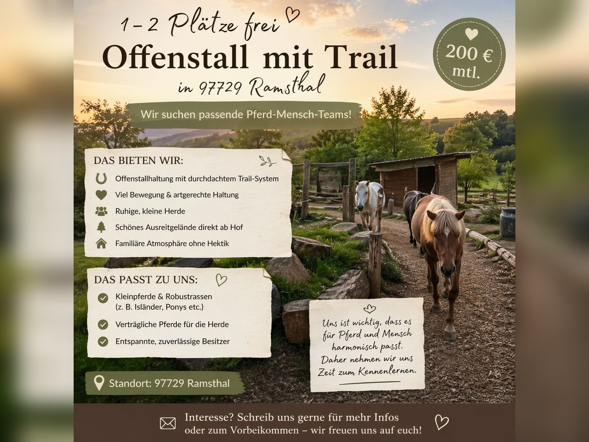🐴 1–3 Offenstallplätze frei in 97729 Ramsthal 🐴 Wir haben aktuell 1–2 Plätze im Offenstall mit Trail frei und suchen passende Pferd-Mensch-Teams 😊 📍 Standort: 97729 Ramsthal ✨ Das bieten wir: * Offenstallhaltung mit durchdachtem Trail-System * Viel Bewegung & artgerechte Haltung * Ruhige, kleine Herde * Schönes Ausreitgelände direkt ab Hof * Familiäre Atmosphäre ohne Hektik 🐎 Das passt gut zu uns: * Kleinpferde & Robustrassen (z. B. Isländer, Ponys etc.) * Verträgliche Pferde für die Herde * Entspannte, zuverlässige Besitzer 💶 Preis: 200 € monatlich Uns ist wichtig, dass es für Pferd und Mensch harmonisch passt, daher nehmen wir uns Zeit zum Kennenlernen 🌿 📩 Schreibt uns gern eine Nachricht für mehr Infos oder zum Vorbeikommen!