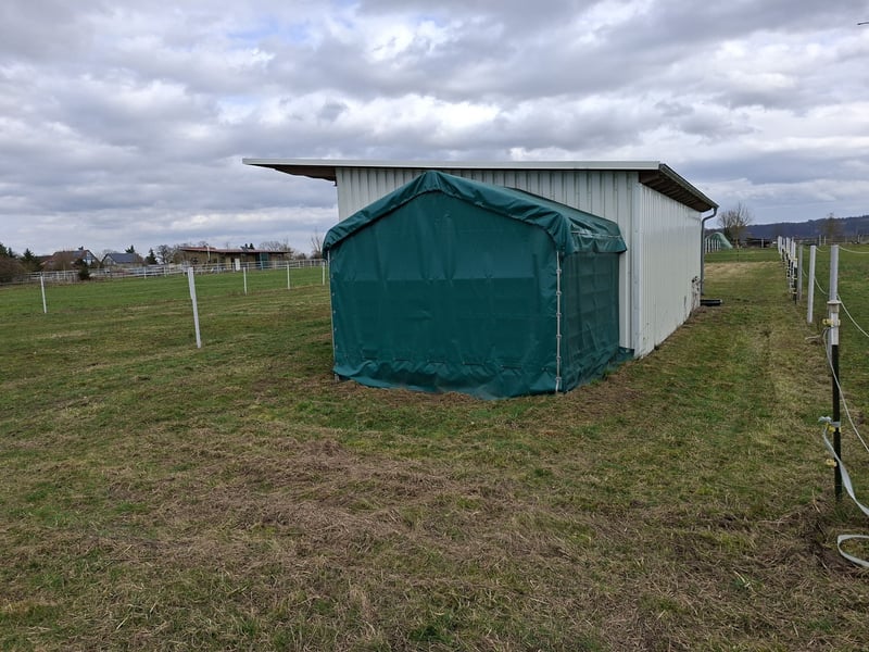 Im Tierkoppelgebiet in Stutensee-Spöck verkaufen wir unseren kleinen Stall für 2 Pferde oder entsprechend mehrere Ponys/Kleinpferde/Isländer. Das Grundstück ist knapp 600 qm groß. Der Stall ist insgesamt 3,70 m x 6 m groß und kann in zwei Boxen unterteilt werden. Direkt am Stall schließt sich ein Heulager an, 6 x 6 m groß auf einer Betonplatte, damit das Heu sicher gelagert werden kann. Das Dach ist weit vorgezogen, so dass z.B. ein Pferdeanhänger untergestellt werden kann. Der Stall ist vom Handwerksbetrieb gebaut worden, überwiegend aus Holz, auf der Wetterseite mit Trapezblech. Weil wir keine Verwendung mehr dafür haben, wollen wir es verkaufen. Derzeit stehen manchmal meine beiden Vierbeiner dort, um das restliche Grundstück abzuweiden. Anschaffung des Grundstücks per Versteigerung für knapp 11.000 Euro, der Stall hat mit Betonplatte, Baugenehmigung und allen Kosten rd. 37.000 Euro gekostet und ist neuwertig. Keine Schäden, kein Verbiss. Anzufahren ist das Grundstück vom nahen Ort aus auf einem befestigten Weg. Ein Brunnen muss noch gegraben werden, also derzeit kein Wasser vor Ort. Ebenso ist dort kein Stromanschluß, aber mit Solar oder per Aggregat ist das möglich. Kontaktaufnahme gerne per WhatsApp unter 0160-8410608. Besichtigung nach Absprache möglich. Stallzelt und Panels sind nicht Bestandteil dieses Angebots, können aber auf Wunsch dazuverkauft werden.