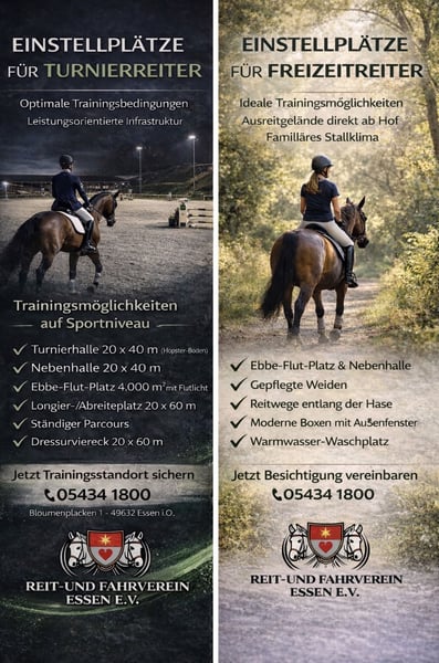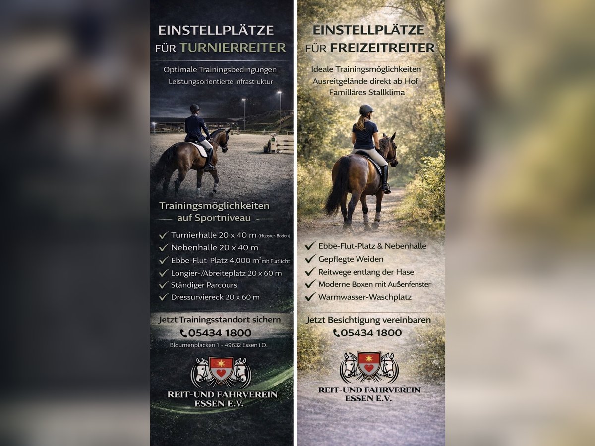 Wir bieten verschiedene Einstallvarianten für eure 4-Beiner an. Auch für Profis oder Amateurreiter bis zu 3 Boxen möglich. Sehr gute Hallenverfügbarkeiten insbesondere auch vormittags. Unsere Anlage liegt mitten im grünen Herzen der Pferdehochburg Oldenburger-Münsterland. Unsere Anlage: Turnierhalle 20*40m - Hopster-Boden Nebenhalle 20*40m Ebbe-Flut Platz 4.000qm mit Flutlicht - Hopster Boden ständiger Parcours und Dressurviereck (angedeutetes 20*58m) Longierplatz/ Abreiteplatz 20*60m mit Flutlicht Geländestrecke mit vielen verschiedenen festen Hindernissen großzügige Weiden und ausreichend viele Paddocks modern und sicher! nahegelegenes Ausreitgebiet an der Hase oder in den Herberger Forsten Unsere Stallungen: moderne Boxen u.a. mit Außenfenster untersch. Boxengrößen für Ponys und Pferde Außenboxen mit viel Luft und Aussicht optimale Versorgung nach modernen Grundsätzen der Pferdehaltung Warmwasser-Indoor Waschplatz mit Solarium & Outdoor-Waschplatz Zugeordnete Paddocks und Weiden