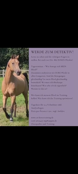 Kursangebot Tageskurs Bewegungsanalyse Du hast Interesse daran einfach mehr über dein Pferd zu erfahren? Du willst das Training mit deinem Pferd optimal gestalten? Kurs bei euch vor Ort mit euren Pferden. Ihr erhaltet Analysebögen. Jedes Pferd wird zusammen analysiert. Was sehen wir? Wo kommt es her? Was kann man verbessern? Was ist schon super? Zusammen erstellen wir Tipps zum Training für jedes Pferd. Anzahl der Teilnehmer 3-6 Preis pro Person 150,- Euro zzgl. Anfahrt. Weitere Angebote: * Osteopathische Behandlung 150,- Euro zzgl. Anfahrt. * Cranio-sacrale-Therapie 70,- Euro zzgl. Anfahrt. * Einzelunterricht Bodenschule/Reitunterricht Pro Einheit circa 45 Minuten auf dem eigenen Pferd berechne ich 45,- Euro zzgl. Anfahrt. * vollständige Analyse inkl. Equipment, Pferd im Stand, Pferd in der Bewegung, an der Longe, unter dem Reiter. Reitunterricht, schriftlicher Trainingsplan. 140,- Euro zzgl. Anfahrt * kurze Sichtung, Kundenerzählung, Trainingsplan 80,- Euro zzgl. Anfahrt * Unterricht, schriftlicher Trainingsplan 95,- Euro zzgl. Anfahrt * tel., Ziele Kd., Fotos Pferd, Trainingsplan 70,- Euro zzgl. Anfahrt * Workshops Es können auch Tageskurse für die Bodenschule, Reiten und vieles mehr für mehrere Teilnehmer am eigenen Reitstall organisiert werden. Gerne komme ich zu Ihnen und Ihrem Pferd, sodass Sie ohne Verladestress trainieren können. Mein Standort ist Bottrop-Kirchhellen. (Unterrichtseinheiten die nicht am Vortag abgesagt wurden, werden entsprechend berechnet.) Osteopathie, Physiotherapie, Horsetraining, Westernreiten, Westerntrainer, Dressurtrainer, TGT Trainer, Reittrainer, Reitlehrer, Pferdegerecht, Pferdefreundlich, Therapeut