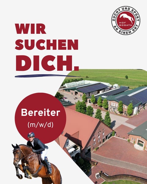 Unser Team wächst – und dafür suchen wir zum nächstmöglichen Zeitpunkt engagierte Unterstützung: 1️⃣ Bereiter/in (m/w/d) Für unseren Turnier- und Ausbildungsstall suchen wir eine/n talentierte/n Bereiter/in mit viel Gefühl für junge Pferde. Zu den Aufgaben gehören die Ausbildung und Vorstellung von Youngstern in Springpferdeprüfungen und Qualifikationen zum Bundeschampionat sowie der Turniereinsatz erfahrener Pferde bis zur Klasse S. 2️⃣ Besamungswart/in (m/w/d) Für unsere Hengststation mit 20 Hengsten und rund 50 eigenen Zuchtstuten suchen wir eine/n qualifizierte/n Besamungswart/in zur Unterstützung unseres Zucht- und Stationsbetriebs. Das bieten wir: ✅ große, etablierte Hengststation bei Bremen ✅ Wohnung direkt am Hof ✅ Vollverpflegung ✅ junges, motiviertes Team ✅ professionelles Arbeitsumfeld mit hochwertigen Pferden Interesse geweckt? ➡️ Dann freuen wir uns auf deine Bewerbung ausschließlich per E-Mail an 📩 post@sosath.com 📞 Für Rückfragen stehen wir gern zur Verfügung: 0175-1666279 oder 0171-7268989 Standort: 27809 Lemwerder www.sosath.com