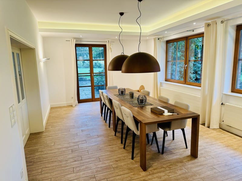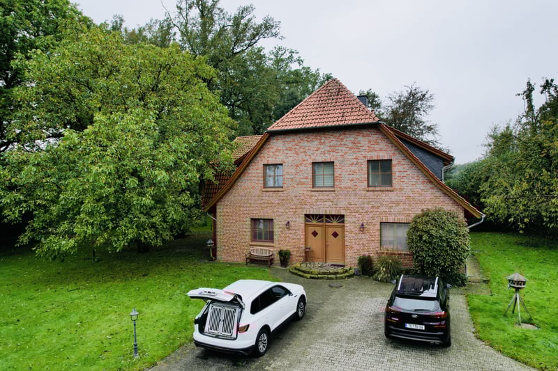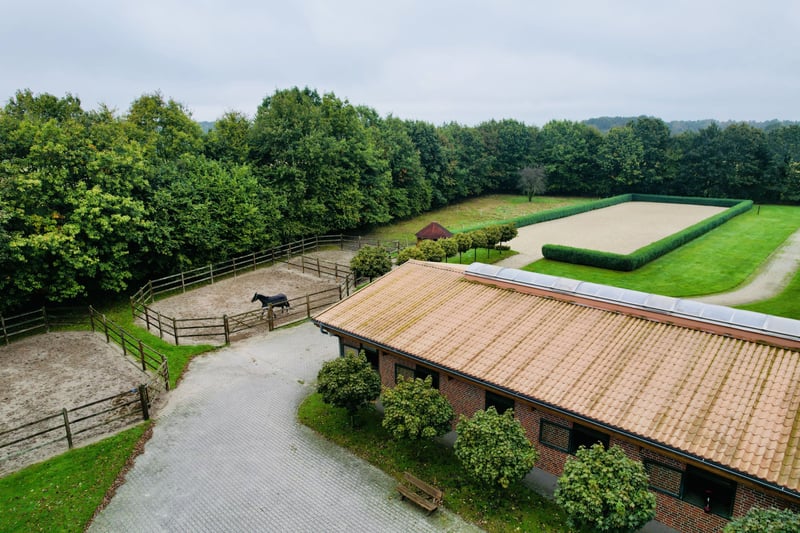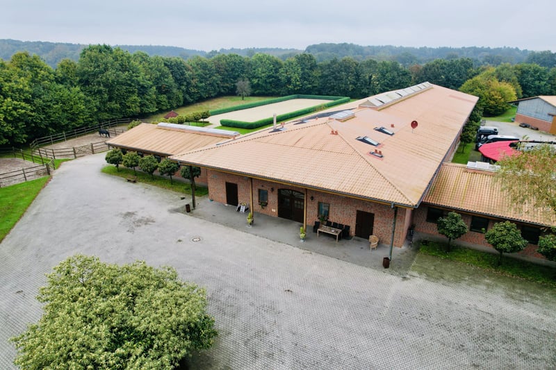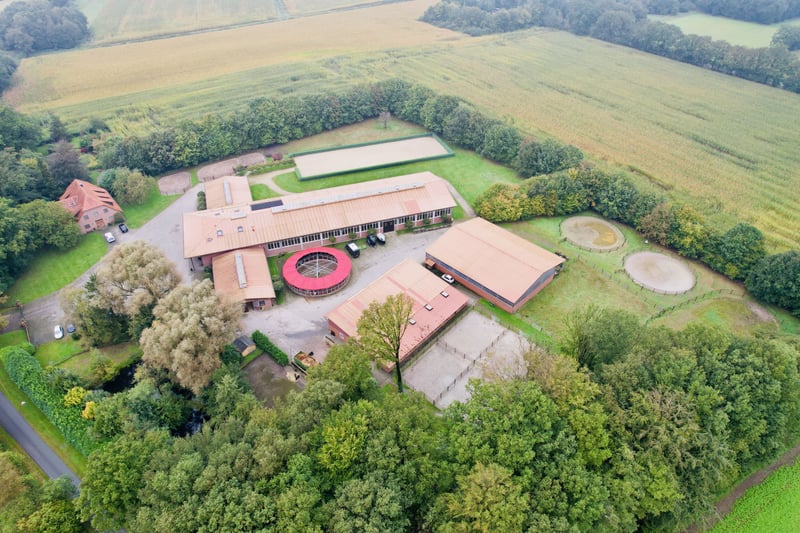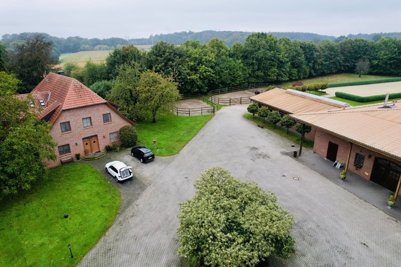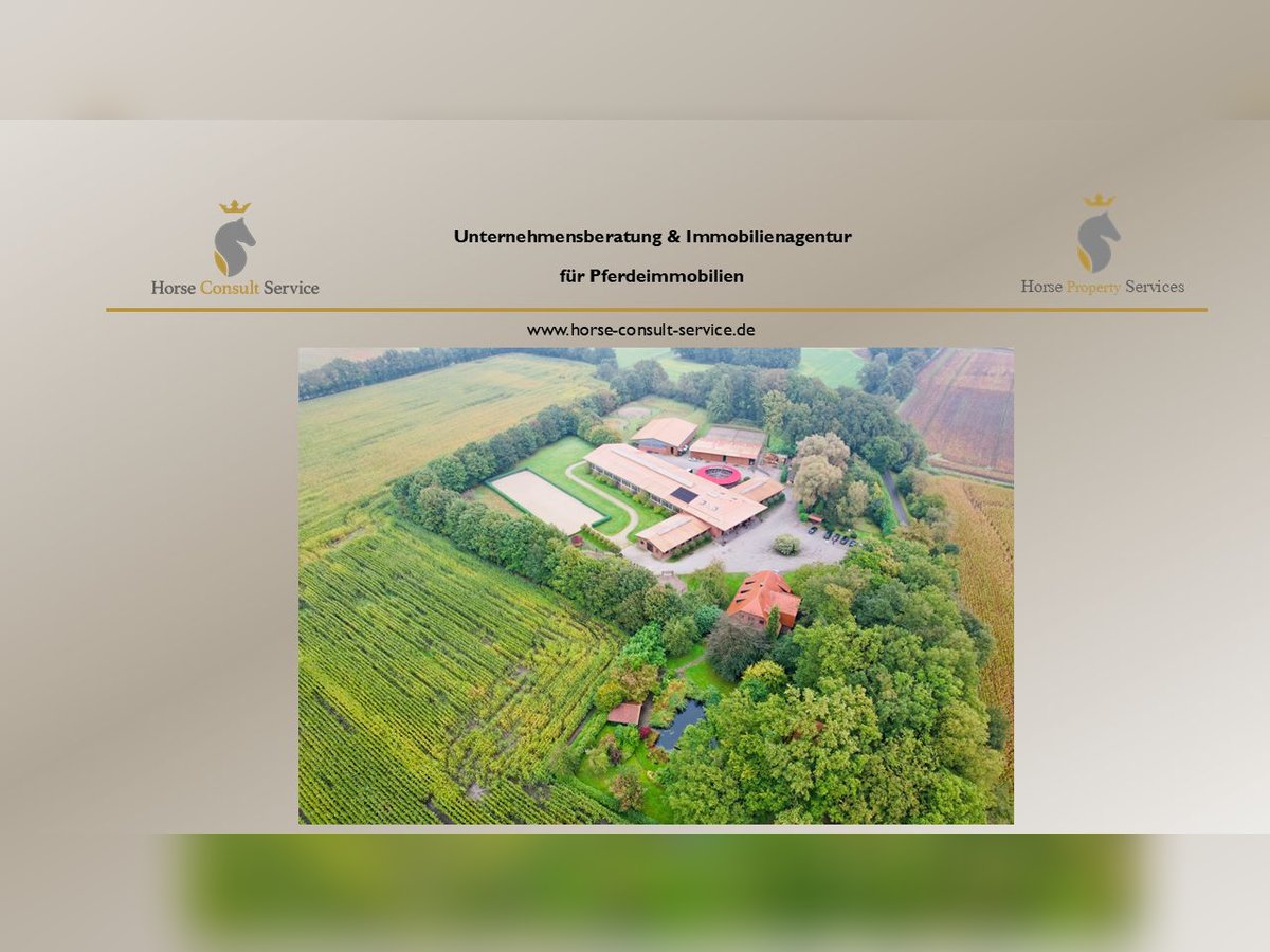 This exclusive, idyllic equestrian estate has been thoughtfully designed and built with high-quality materials by its owners, creating a luxurious yet cozy atmosphere from the very first moment. The property offers both comfortable living spaces and top-tier training facilities for riders and horses, without compromising on the upscale lifestyle. Located in a charming rural setting surrounded by meadows and trees, the estate spans an impressive total area of approximately 4.5 hectares (45,000 m²). Despite its peaceful surroundings, the center is easily accessible via the nearby highway. Major cities such as Osnabrück (airport approx. 45 minutes), Düsseldorf (airport approx. 1 hour 15 minutes), Münster (about 45 minutes), and Enschede (around 20 minutes) are also conveniently reachable. Living Accommodation: The country house (built in 1999) offers approximately 395 m² of living space and provides an exclusive residence: Ground Floor: - Spacious entrance hall with toilet, washbasin, and shower - Reception room with open fireplace and an elegant staircase to the first floor - Dining area with open designer kitchen and kitchen island - Large salon - Office - Utility room with staircase to the basement First Floor: - Gallery and corridor - Four bedrooms, including a master suite with walk-in wardrobe, en-suite bathroom, whirlpool tub, and sauna - Three additional bedrooms - Second bathroom with shower - Attic Additional features of the country house: - Terrace and spacious landscaped garden - Swimming pond and two pavilions Additional Living Spaces: - Country Cottage: approximately 80 m², comprising a kitchen, two bathrooms, and two living rooms with integrated sleeping areas. - Apartment (built in 2000): located above the riding hall, featuring two separate living/sleeping rooms with shared kitchen and bathroom. Heated with gas. Equestrian Facilities: - Heated indoor riding arena (20 x 60 m) with sprinkler system - Total of 42 boxes, including 24 with windows in the main stable and an additional 8 with windows - Lounge, utility room, WC, two tack rooms - Cold and hot water supply, wash boxes, four grooming stalls - Solarium, blow-drying solarium, heated winter blanket storage - Second riding hall (20 x 30 m) - Hay and straw barn, machinery and equipment hall - Outdoor riding arena (60 x 20 m) with irrigation system and pavilion - Several paddocks, some with additional grazing options The estate features two separate access points: a direct entrance from the main residence and a separate driveway for clients. The pathways within the property are paved, and the entire area is securely fenced. An emergency fire pond adds an extra layer of safety. Summary: - Total area: approximately 4.5 hectares (45,000 m²) - Main country house: approx. 395 m² - Apartment (above the riding hall) - Staff and guest house (Country Cottage) - Swimming pond with pool house - Car and truck parking facilities - 42 boxes, 32 with windows (3.80 x 3.80 m) - Two indoor riding halls and outdoor arena - Swimming pond with pool house - Ample parking for cars and trucks This exclusive residence combines comfort and charm in a unique way, making it ideal for discerning equestrians who value an upscale environment and excellent training facilities. It is a perfect retreat for horse sports, family celebrations, or peaceful moments with maximum privacy. Location: Emsbüren, a picturesque community in the heart of the Emsland region, offers a perfect balance between nature and urban connectivity. The area is renowned for its scenic meadows, forests, and river landscapes, providing ideal conditions for relaxation and outdoor activities such as riding, hiking, and cycling. The location benefits from excellent transport links. The nearby A31 highway provides quick access to larger cities like Münster, Osnabrück, and Enschede. The international Münster/Osnabrück Airport is also just a short drive away. Emsbüren itself boasts good infrastructure, including schools, shopping facilities, and restaurants. Cultural highlights such as regional festivals and traditional events, along with proximity to natural parks, make this area a desirable and vibrant place to live—offering both tranquility and variety.