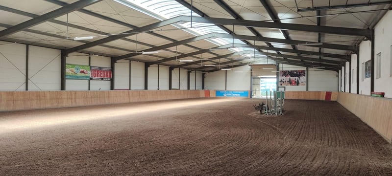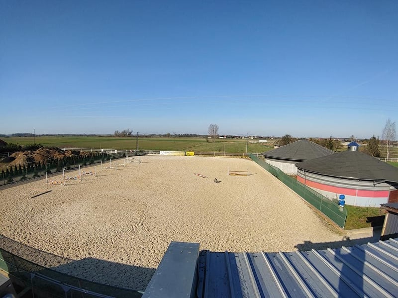Indoor arena (built 2020): 48m x 23m, equipped with a new quartz floor (2023) with automatic irrigation from underneath