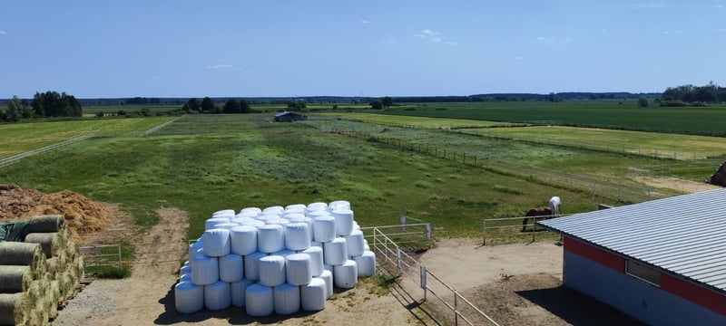 Hala łukowa na siano i słomę (wybudowana 2024 r.): 30m x 12m, wysokość 7m, pomieści 600-800 bali