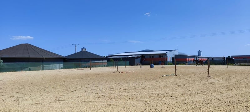 Reithalle (gebaut 2020): 48m x 23m, ausgestattet mit neuem Quarzsubstrat (2023) mit automatischer Bewässerung von unten