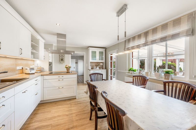 This property was built in 1956 and 1999 on a 8,976 sqm plot of land in a quiet, rural outskirts location with unobstructed views in the district of Teglingen, Meppen. The surroundings offer a pleasant mix of natural living and convenient access to everyday amenities. This spacious rural estate includes two residential buildings on a large parcel of land with versatile options for living, working, and keeping animals. The original house from 1956 was expanded in 1999 with an additional residential building. The combination of traditional construction and modern amenities allows for flexible use and creative design options. In addition to the residential buildings, there are extensive utility areas and well-maintained outdoor facilities. The natural setting provides an unobstructed view of the surrounding fields and combines peaceful living with good accessibility to the district town of Meppen. A photovoltaic system installed in 2004 ensures additional income through full feed-in of electricity. The residence built in 1999 features a spacious and modern layout. On the ground floor, there is an open foyer with a wardrobe area, a bright living/dining room with a tile stove and direct access to the terrace, as well as a large country-style kitchen with a breakfast nook (built-in kitchen included in the purchase price). The stylishly designed summer conservatory, added in 2021, extends the living space and provides a sheltered outdoor retreat. A guest WC completes the room layout on this level. The upper floor offers a large master bedroom with an adjoining walk-in closet, two additional rooms that can be used as children's, work, or guest rooms, and a modern daylight bathroom with two washbasins, a walk-in shower, and built-in cabinets. The partial basement includes a storage room, a fitness room, and the heating room with space for a washing machine and dryer. The original house has been modernized and features a bright, glazed winter garden on the ground floor, harmoniously connecting the living area with the outdoor space. The spacious living and dining room provides ample space for social gatherings, while a separate TV room offers additional retreat options. The modern fitted kitchen from 2016 is included in the purchase price. It is complemented by a utility kitchen with a nostalgic oven, offering extra storage and workspace. The hallway leads to a guest WC with a sink and toilet, as well as a bedroom. A daylight bathroom with a shower, corner bathtub, and washbasin completes the room layout on this floor. Upstairs, there are three additional rooms that can be flexibly used as bedrooms, guest rooms, or offices. The attic is accessible via a pull-down ladder. The partial basement contains a storage room and the heating system. Both houses offer various usage concepts. They are suitable for multi-generational living, as they provide separate living units. The original house, with a bedroom and bathroom on the ground floor, also allows for single-story living. Partial rental is also possible to generate additional income. For horse enthusiasts, the estate offers ideal conditions. The utility building has adaptable stables and storage areas for hay, straw, or other equipment. There is also a dedicated area for horse care, a saddle room, and an enclosed outdoor riding arena with natural footing. The adjoining pasture allows for species-appropriate animal husbandry. The surrounding agricultural fields are currently leased, with the possibility of taking over the lease by arrangement.