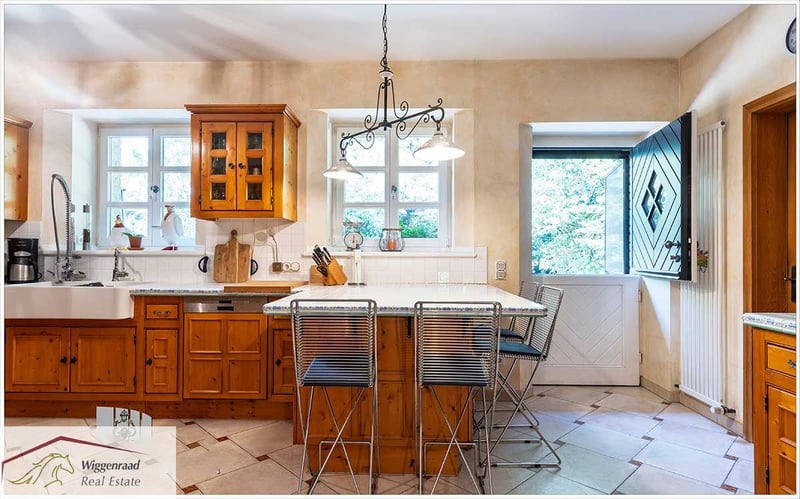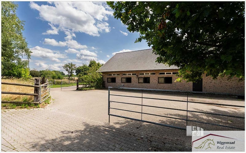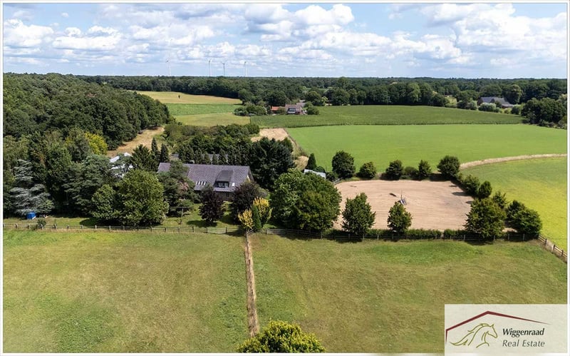 Ruiterfaciliteit voor de perfecte balans tussen gezinswoning en paardenpassie Het paardenpension, een ensemble van vier gebouwen, ligt vrij en volledig omgeven door groen op een perceel van circa 6,5 hectare tussen bos en weilanden. Het hoofdgebouw, ongeveer 520 m² groot, bevat vier zelfstandige wooneenheden met elk een eigen toegang. De ruime hoofdwoning van circa 344 m² beschikt over een gezellige open woonkeuken met kookeiland en voorraadkast in de entree. Een extra kamer, gecombineerd met een rolstoeltoegankelijke badkamer, dient als comfortabel gastenverblijf. Het hart van de begane grond is de lichte, ruime woonkamer met een zadeldak, grote raampartijen, terrasdeuren en een gezellige tegelkachel. Een klein kantoor is vanuit de woonkamer bereikbaar. Via een massiefhouten trap is de overdag verlichte galerie met bibliotheek te bereiken. Aangrenzend aan de woonkamer bevindt zich een grote hal die leidt naar twee lichte kinderkamers met volledige badkamer, een wasruimte en via een tweede trap het zadeldak-slaapkamer met badkamer en suite, dakbalken en uitzicht op de nok. De bovenverdieping herbergt tevens een medewerkerswoning van circa 70 m² met open zolderruimte en nog een ca. 100 m² grote woonunit. Alle woningen beschikken over een eigen ingang. Technisch gezien is het erf modern uitgerust met vloerverwarming, een BUS-systeem, traditionele ramen met moderne isolatie, een elektronische sluitinstallatie en een airconditioning in de hoofdslaapkamer. Eigen grondwaterwinning, een redundante oliecentrale, regenwaterafvoer voor de weilanden en een zonne-energiepotentieel zorgen voor toekomstbestendigheid en onafhankelijkheid. Voor een diervriendelijke en gepassioneerde paardenhouderij biedt de faciliteit uitstekende voorwaarden: acht boxen in de hoofdstal met zadelkamer, ruiterhokje, wasbox en hooinstallatie. Tien extra buitenboxen, inclusief een tweede zadelkamer, wachten op nieuwe dieren. Een lichte rijhal met verlichting, een grote paddock en meerdere weilanden met schaduwplekken en drinkbakken bieden optimale omstandigheden voor training en vrije beweging. Direct grenzend starten rijroutes door velden, bossen en weiden – een genot voor ruiter en paard het hele jaar door. Thuis zijn in je eigen leven, wie zou dat niet willen? Op deze unieke locatie wordt dit nieuwe geluk voor jou, je gezin en je paarden werkelijkheid, zonder grenzen. Indeling van de woning op Niederrhein Verdeling naar wooneenheden met woonoppervlakte (circa, in m²). Opmerking: de wooneenheden zijn flexibel samen te voegen of apart te gebruiken. Momenteel vormen wooneenheden 1 en 2 één geheel van circa 344 m²: woonkeuken, garderobe/entree, keuken, berging/voorraad, gastenverblijf, gang, badkamer, woonkamer met galerie/bibliotheek, kantoor, technische ruimte. Hal, 2 kinderkamers, wasruimte/techniek, badkamer, hoofdslaapkamer op de bovenverdieping, badkamer en suite, gang, inloopkast en bergruimte. Wooneenheid 3 – ca. 70 m² (medewerkers): wonen/eetkamer, keuken, garderobe, berging, gang, badkamer, slaapkamer, zolder (geen afbeelding). Wooneenheid 4 – ca. 100 m² (gasten/familie): hal/wonen/eetkamer, garderobe, badkamer, 2 slaapkamers, keuken, berging, zoldergalerie. Technische voorzieningen: vloerverwarming, moderne ramen/deuren in landhuisstijl, BUS-systeem, elektronisch slotensysteem, airconditioning in de hoofdslaapkamer, eigen grondwaterwinning, moderne oliekachel (dubbelbrand), regenwaterafvoer voor de weilanden, driekamersysteem. Faciliteiten van het paardenpension Hoofdstal met 8 paardenboxen, zadelkamer, ruiterhokje, badkamer met douche, wasbox en opslag voor voer en levering. Buitenboxen met 10 boxen, eigen zadelkamer en drinkbakverwarming. Lichtoverdekte rijhal (ca. 16,5 x 35 meter) met aansluitend hooi- en stroopslag. Grote rijbaan (ca. 60 x 30 meter), in de buitenruimte vijf weilanden met schaduwplekken en drinkbakken, regenwaterafvoer voor de terreinen. Twee aparte betonnen poetsplaatsen, fruitboomgaard met oude bomen. Directe aansluiting op rijroutes door het omliggende landschap in het natuurpark Hohe Mark. Bijzonderheden voor paardenhouderij: Verwarmde drinkbakken in de buitenboxen – betrouwbare watervoorziening ook in de winter. Eigen grondwaterwinning voor stal en terrein – onafhankelijke, kostenefficiënte voorziening. Regenwaterafvoersysteem voor directe watervoorziening van de weilanden. Directe toegang tot schilderachtige rijroutes in het natuurpark Hohe Mark. Privé locatie in idyllische omgeving aan de Niederrhein Het landgoed ligt afgelegen binnen de gemeente Hünxe aan de Niederrhein, in het Regierungsbezirk Düsseldorf. Het is omgeven door een landschap van gemengd bos, velden en weilanden. De locatie biedt directe toegang tot schilderachtige rijroutes in het natuurpark Hohe Mark. Hünxe ligt aan de westelijke rand van het Ruhrgebied en combineert het beste van twee werelden: een landelijke omgeving met directe aansluiting op het Ruhrgebied. De gemeente wordt beschouwd als een rustige, leefbare plek in de zogenaamde randstad – populair bij gezinnen, forenzen en iedereen die waarde hecht aan kwaliteit van leven. De omgeving rondom Hünxe heeft bovendien een hoog recreatief waarde: wandelingen langs het Wesel-Datteln-kanaal, door het Hünxer Bachtal of het Dämmerwald, evenals uitgebreide fietstochten – zonder stadsverkeer. Ook het recreatieaanbod is gevarieerd: een overdekt zwembad, meerdere tennisbanen en de golfclub Weselerwald met bijbehorende horeca liggen in de buurt. Een uitstekende wellnessfaciliteit, Livingroom SPA, bevindt zich in het nabijgelegen 4-sterren Landhotel Voshövel. De Gesamtschule Hünxe biedt moderne onderwijsconcepten in een levendige schoolgemeenschap. Kindergärten zijn eveneens goed bereikbaar. Wij presenteren deze woning in samenwerking met immobilienteam.de