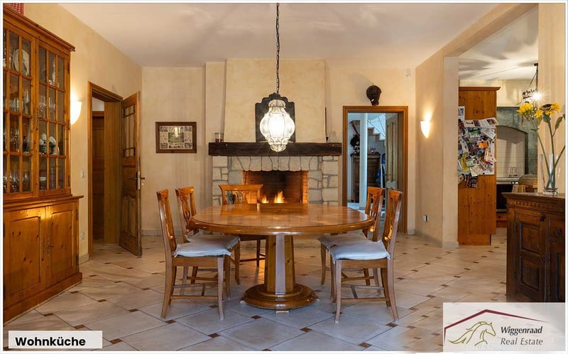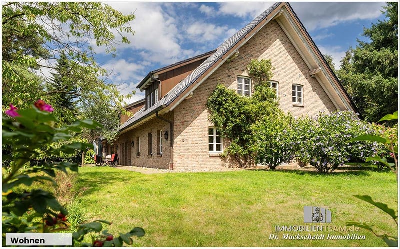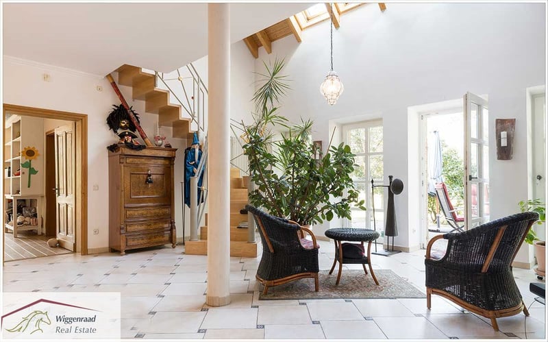 Equestrian Facility Offering the Perfect Balance Between Family Comfort and Horse Passion This estate, comprising four buildings, is set in a fully private, lush green environment on approximately 6.5 hectares nestled between forest and pastures. The main house, approximately 520 m², includes four independent living units with separate entrances. The spacious main living area, about 344 m², features an inviting open-plan kitchen with a stove fireplace and pantry in the entrance hall. An additional room combined with a barrier-free bathroom serves as a comfortable guest wing. The heart of the ground floor is the large, bright, gable-roofed living room with floor-to-ceiling windows, terrace access, and a cozy tiled stove. A small study is accessible from the living room. An authentic hardwood staircase leads to the gallery, illuminated by roof windows, which includes a library. Adjacent to the living room is a large hallway connecting to two bright children’s rooms with a full bathroom, a utility room, and a second staircase that leads to the gable-roofed master bedroom with en-suite bathroom, exposed ceiling beams, and gable view. The upper floor also hosts a staff apartment of approximately 70 m² with an open attic space, as well as a further living unit of around 100 m². All apartments have their own separate entrance. The estate is technically up-to-date, featuring underfloor heating, a bus system, modern insulated classic windows, an electronic locking system, and air conditioning in the master bedroom. An independent groundwater supply, a redundant oil heating system, rainwater drainage for the pastures, and photovoltaic potential ensure future viability and independence. For optimal horse husbandry, the facility offers excellent conditions: eight boxes in the main stable with tack room, rider’s lounge, wash bay, and feed storage. An additional ten outdoor boxes with a second tack room await new equine residents. A bright indoor riding hall with lighting, a large paddock, and several pastures with shade areas and drinking troughs provide ideal training and turnout conditions. Directly adjacent are riding paths through fields, forests, and meadows, offering year-round riding pleasure. Living at your own private estate—who wouldn’t wish for that? At this incomparable location, new happiness for you, your family, and your horses can become a reality without limits. Layout of the Niederrhein Residence Room distribution by living units with approximate living space (in m²). Note: The units are flexible and can be combined or used separately. Currently, units 1 and 2 form one entity of about 344 m²: living kitchen, wardrobe/entrance hall, kitchen, storage/pantry, guest wing, corridor, bathroom, living room with gallery/library, study, technical room, hallway, two children’s rooms, utility/technical/storage room, bathroom, master bedroom upstairs, en-suite bathroom, dressing room, storage. Unit 3 – approx. 70 m² (staff): living/dining area, kitchen, wardrobe, storage, corridor, bathroom, sleeping area, attic space (no illustration). Unit 4 – approx. 100 m² (guests/family): hallway/living/dining area, wardrobe, bathroom, two bedrooms, kitchen, storage, attic gallery. Technology: underfloor heating, contemporary country-style windows/doors, bus system, electronic locking system, air conditioning in the master bedroom, own groundwater supply, modern oil boiler (dual burner), rainwater drainage for pastures, three-chamber system. Equestrian Facility Features Main stable building with 8 horse boxes, tack room, rider’s lounge, bathroom with shower, wash bay, and feed delivery/storage area. Outdoor box system with 10 boxes, private tack room, and heated drinking troughs. Indoor riding hall with lighting (approx. 16.5 x 35 meters), adjacent hay and straw storage. Large outdoor riding arena (approx. 60 x 30 meters), five pastures with shade shelters and drinking troughs, rainwater drainage for the fields. Two separate concrete mucking pads, fruit orchard with old trees. Direct access to riding trails through the surrounding landscape in the Hohe Mark Nature Park. Special Features for Horse Husbandry: Heated drinking troughs in outdoor boxes – reliable water supply even in winter. Own groundwater supply for stables and grounds – independent and cost-effective. Rainwater drainage system for direct pasture irrigation. Direct access to scenic riding routes in the Hohe Mark Nature Park. Secluded Location in Idyllic Setting at the Lower Rhine The property is situated in a private setting within the municipality of Hünxe on the Lower Rhine in the Düsseldorf administrative district. The estate is embedded in a landscape of mixed forests, fields, and pastures. The location provides immediate access to scenic riding trails in the Hohe Mark Nature Park. Hünxe lies on the western edge of the Ruhr area, combining the best of two worlds: a rural environment with direct connectivity to the Ruhr metropolis. The community is regarded as a quiet, livable retreat in the so-called “Goldkreis” – popular among families, commuters, and those valuing quality of life. The surrounding area offers high recreational value: walks along the Wesel-Datteln Canal, through the Hünxer Bachtal or Dämmerwald are possible, as are extensive cycling tours—completely without city traffic. Leisure options include an indoor swimming pool, several tennis courts, and the Weselerwald Golf Club with an attached restaurant. The nearby 4-star Voshövel Country Hotel offers excellent wellness facilities, including the Livingroom SPA. The Hünxe Comprehensive School stands for modern education within a vibrant school community. Kindergartens are also easily accessible. We present this property in cooperation with immobilienteam.de