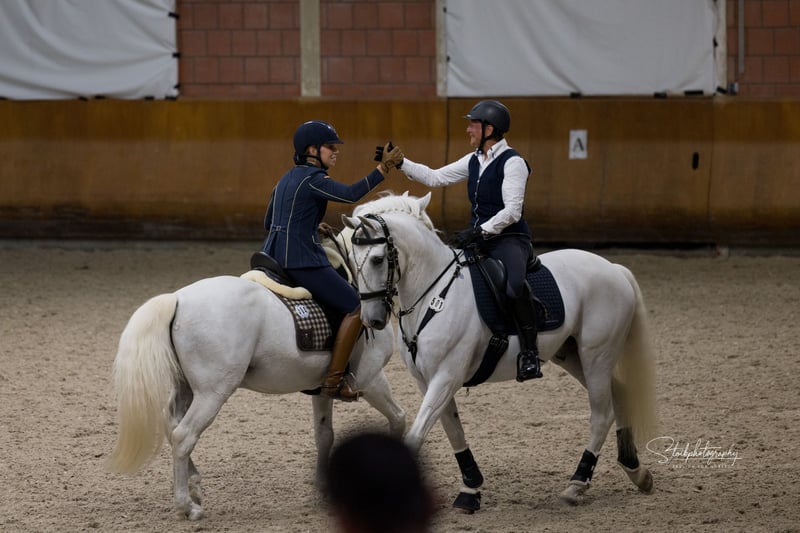 Ufano des Iscles è uno stallone della Camargue impressionante e molto forte. È stato autorizzato dal Mas de la Cure in Camargue e importato da noi nel 2014. La sua licenza è stata confermata dal Rhineland Studbook per la Germania e si dice che sia di grande importanza per l'allevamento tedesco. Il suo primo puledro è molto promettente e rimarrà per essere addestrato come candidato alla licenza. Ufano è addestrato al dressage fino al livello avanzato (S), salta in modo pulito doppi e tripli cambi e sta attualmente lavorando sui singoli cambi. Mostra impegno e pulizia nel piaffe e nei passaggi. Lavora sul bestiame, è impeccabile anche su percorsi impegnativi ed è impavido in campo. Mostra nervi saldi alle fiere e agli spettacoli e presta molta attenzione alla sua mandria. La sua massa barocca lo rende uno spettacolo impressionante. Tuttavia, il cavallo è bravo negli aiuti, si impegna molto ed è anche manovrabile. Ha registrato dei puledri in Camargue nel 2013. Abbiamo selezionato il nostro "Brummer" principalmente per le fattrici già molto grandi, al fine di ottenere un riuscito mix di bellezza e robustezza originale del cavallo della Camargue. Ufano è sempre un cavallo dall'aspetto un po' ansioso che lavora con diligenza, ma è anche determinato se non gli viene chiesto di fare qualcosa correttamente. Il suo carattere è davvero impeccabile.