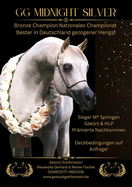 GG MIDNIGHT SILVER ist ein absoluter ALLROUND CHAMPION im Sport, im Schauring und durch seine qualitätsvolle prämierte Nachzucht! Ihre einzigartige Gelegenheit solch ein Multitalent zu erwerben. Absolute Chance für Züchter oder Zucht Einsteiger! Wir wünschen uns für ihn ein sehr gutes liebevolles neues Zuhause wo er im günstigsten Fall zum Deckeinsatz kommt. Ist aber keine Bedingung. Er deckt an der Hand und ist bei uns auch in der Herde problemlos gelaufen. Für den großen Sport möchten wir ihn nicht verkaufen aber mit etwas Muskelaufbau für den Freizeitbereich bestens geeignet. Allerdings als Hengst nicht für Anfänger geeignet. Er ist gut erzogen und leicht zu handeln aber Erfahrung in der Hengsthaltung und im Umgang sollten vorhanden sein. Wegen Reduzierung des Zuchtbestandes zu verkaufen! Bei Interesse können sie gerne weitere Informationen erhalten und gerne bei einer Besichtigung Midnight Silver kennen lernen. Wir freuen uns auf ihren Besuch