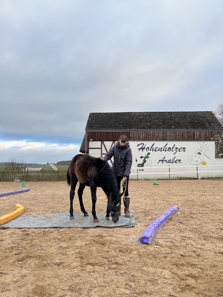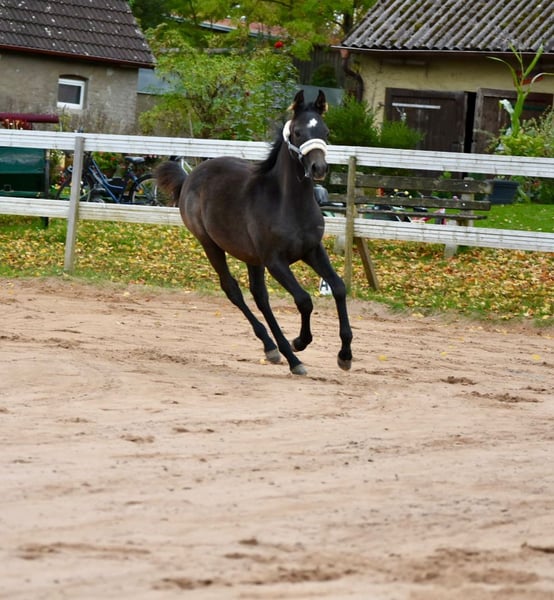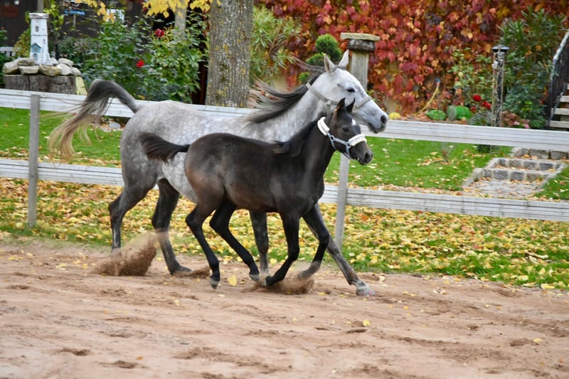 Maysouna von Hohenholz - eine ganz besondere Tochter von VAG Elea und Mefisto Sie stammt aus der starken seltenen Mutterlinie der Manda. Eine menschenfreundliche, Reit- und Leistungskinie aus urpolinschen u Altdeutschen Linien. Mefisto - ihr Vater - ein leistungsgeprüfter und absolut braver Hengst. Im Trab und im Galopp glänzte er je mit einer 9,0 als Wertnote! HLP über Rennen mit 85GAG Er lief bis CEI**120km erfolgreich und war BaWü Meister. Er überzeugt durch überdurchschnittliche Grundgangarten und super Reitpferdeexterieur Ihre Mutter Elea steht seit 1,5 Jahren bei uns auf dem Hof. Viele Pferde aus dieser Linie sind erfolgreich im Distanzsport. Unter anderen lief der Vollbruder von Eleas Mutter CEI 160km, der Halbbruder CEI 160km sowie der WM Teilnahme. Eleas Mutter lief bis 80km erfolgreich bevor sie in die Zucht ging. Die Stute hat einen liebenswerten Charakter und ist für Alles zu haben. Ob Ponyreiten mit kleinen Kindern, GHT, oder entschlossen und sehr leistungsbereit im Distanztraining. Sehr menschenbezogen ist sie der Liebling vieler am Hof. Im Mai erblicke Maysouna das Licht der Welt und wächst seitdem ua mit Gleichaltrigen auf. Im großzügigen Offenstall mit angrenzenden Weiden genießt sie Ihre Kinderstube. Da bei uns immer Aktion ist am Hof, kennt sie das rege Hofleben mit Traktor, vielen Kindern, Eseln, Ziege, Hunde anderen Tieren und Landmaschinen. Maysouna ist halfterführig, anständig beim Hufe machen und kennt auch schon Hänger fahren. Aufgeschlossen und Neugierig erkundet sie täglich die Welt. Maysouna wurde bei der Musterung von der Kommision mit zweimal sehr gut prämiert. Wir wünschen uns einen artgerechten Platz wo sie mit gleichaltrigen aufwachsen kann.