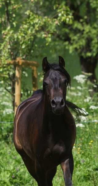 Étant donné que nous passons à une monte exclusivement en étalons noirs, c'est avec le cœur lourd que nous vendons nos jolis poulinières colorées. Notre BP Es’mee est vraiment exceptionnelle, elle se distingue par son tempérament affectueux... on pourrait presque dire qu’elle a une touche de trop de tendresse, elle est calme, curieuse et ouverte à tout, c’est ainsi que l’on la décrirait. Elle a une conformation très correcte, avec une origine intéressante : GG Scherapee d’Europe Al Khidar x Primus S (noire homozygote). Si vous êtes intéressé, n’hésitez pas à demander plus d’informations, je peux vous répondre volontiers par WhatsApp, car nous sommes en pleine montagne avec une mauvaise réception téléphonique. Un transport est envisageable.