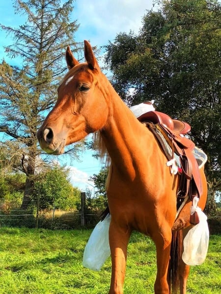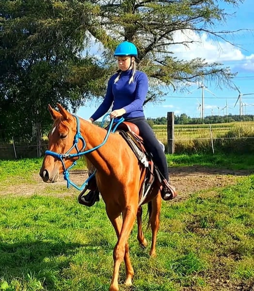 For sale is a beautiful Thoroughbred-Arabian mix mare, born in 2022. With her elegant chestnut coat and a height of 156 cm, she is truly a sight to behold. This talented mare is exceptionally suited for endurance sports and already shows great potential. She is spirited yet manageable, with a friendly character that makes her an ideal partner for ambitious riders. The mare is well-socialized and has already gained initial experience in handling with other horses. She is healthy, vaccinated, and regularly dewormed. If you are looking for a promising endurance horse partner, this Thoroughbred-Arabian mare is just right for you! For inquiries or more information, please feel free to contact us.