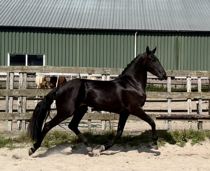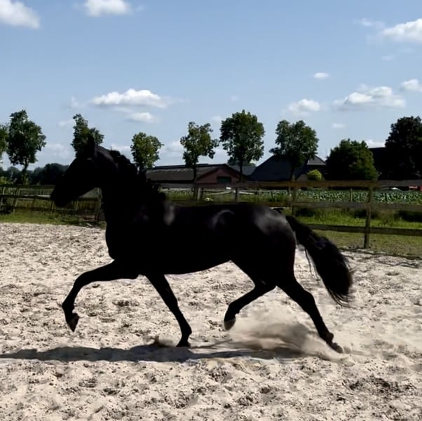 Beautiful 4-year-old PRE x Frisian mare She is 16.0 hands tall, with a lot of substance and will certainly grow a bit more. Libby enjoys extra movement and has three very good gaits. Aside from some lunging, she is still green and completely untrained. She is in possession of a passport.