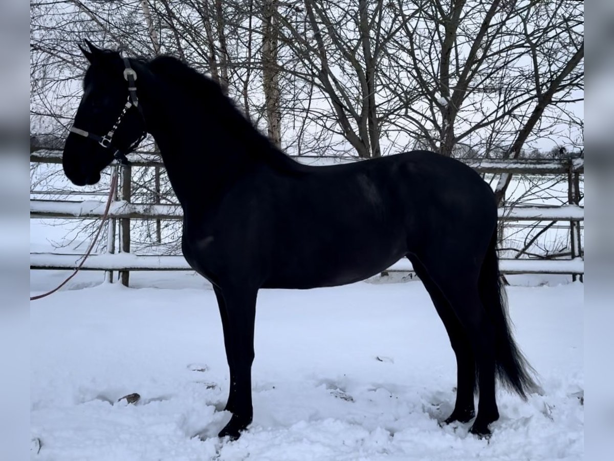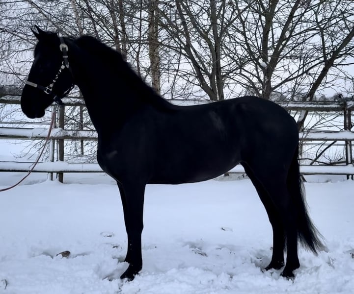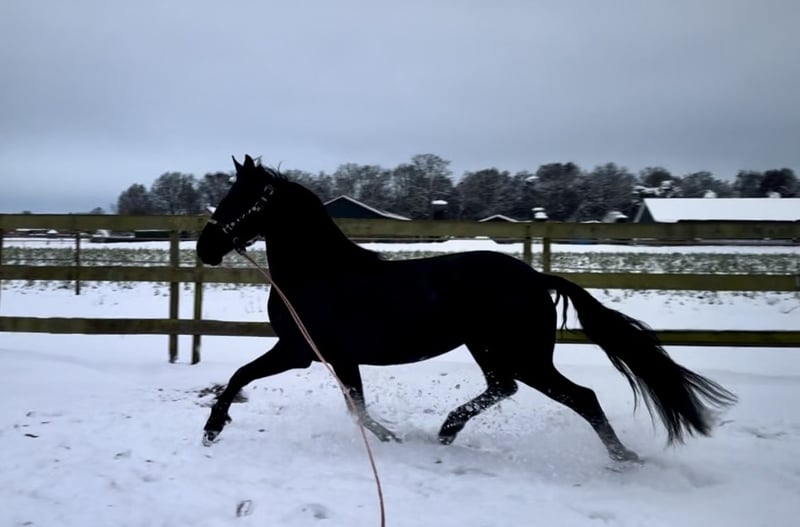A 4.5-year-old PRE x Friesian black mare She is 16.0 hands tall, with a strong build and will likely grow a bit more. Libby benefits from additional exercise and has three very good gaits. Aside from some lunging, she is still green and completely untrained. She comes with a passport.