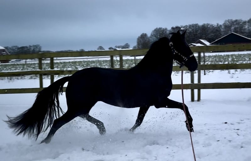 Hele gave 4,5 jarige PRE X Fries gitzwarte merrie ze is 160 groot met veel body en zal zeker nog wat groeien. Libby kan extra bewegen en heeft 3 hele goede gangen. Ze is op wat longeren na nog groen en nog helemaal onbeleerd. ze is in het bezit van een paspoort.