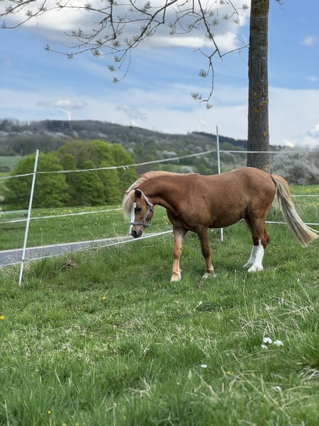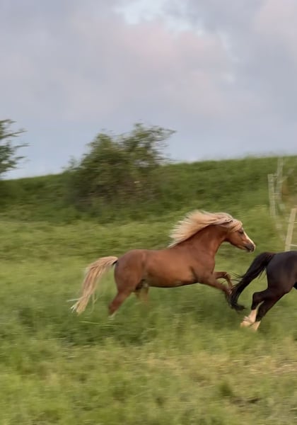 For sale: Welsh A stallion Born: May 2022 Color: Chestnut Height: 116cm (still growing) Awarded as a suckling foal Mother: Erlensee Joy - Welsh A - Main Stud Book S1 Father: Voermanhof Zenit - Welsh A - HB 1 Has full papers and ownership certificate * He knows the foal ABC * Very good and beautiful gaits * Can be groomed in the herd as well as in the box without being tied or haltered * Familiar with box (in winter) * Familiar with open stable (in summer) * Stands calmly next to mares * Always manageable, even by children; leads and can be groomed * Can be lunged * Familiar with saddle and bridle * Currently being worked on for backing from the ground * Responds very well to voice commands * Very cuddly * Shoeing and loading friendly * Familiar with and masters spook training He would be very happy to meet you. For more information or interest, please get in touch.