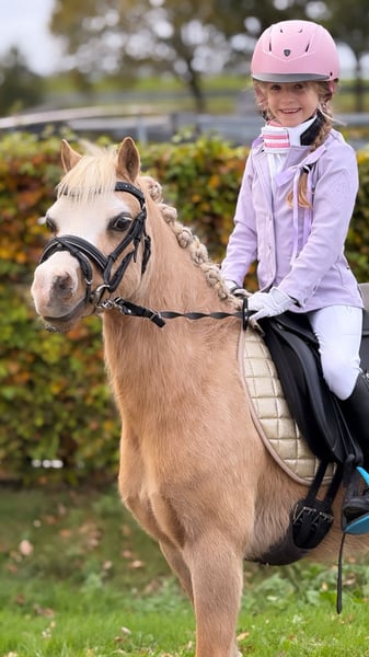 Deze pony is echt een schat — mega braaf en kindvriendelijk, ideaal voor de kleinste ruitertjes of als eerste pony. Ze gaat keurig mee aan het touwtje op BIXIE-wedstrijden en vindt alles leuk zolang ze aandacht krijgt.