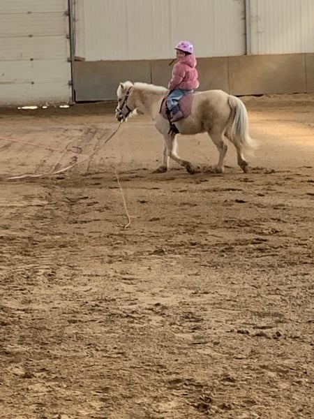Since our children unfortunately no longer show the expected interest, we are offering our sweet little pony for sale. She is approximately 7 years old and has an excellent temperament with children. She happily tolerates all kinds of mischief, whether it's visits to the kindergarten or rides out into the countryside. She is very rideable, even if the kids need to assert themselves a bit — typical pony behavior. Unfortunately, she is underchallenged with us and has developed a pacing gait as a result. When worked regularly and properly, this gait disappears completely. It is purely a muscular issue, confirmed by veterinarian and osteopath. She has competition experience and has been quite successful up to novice level dressage. She is definitely a young pony with potential and beautiful movement. I can also imagine her being suitable for therapeutic riding and driving.